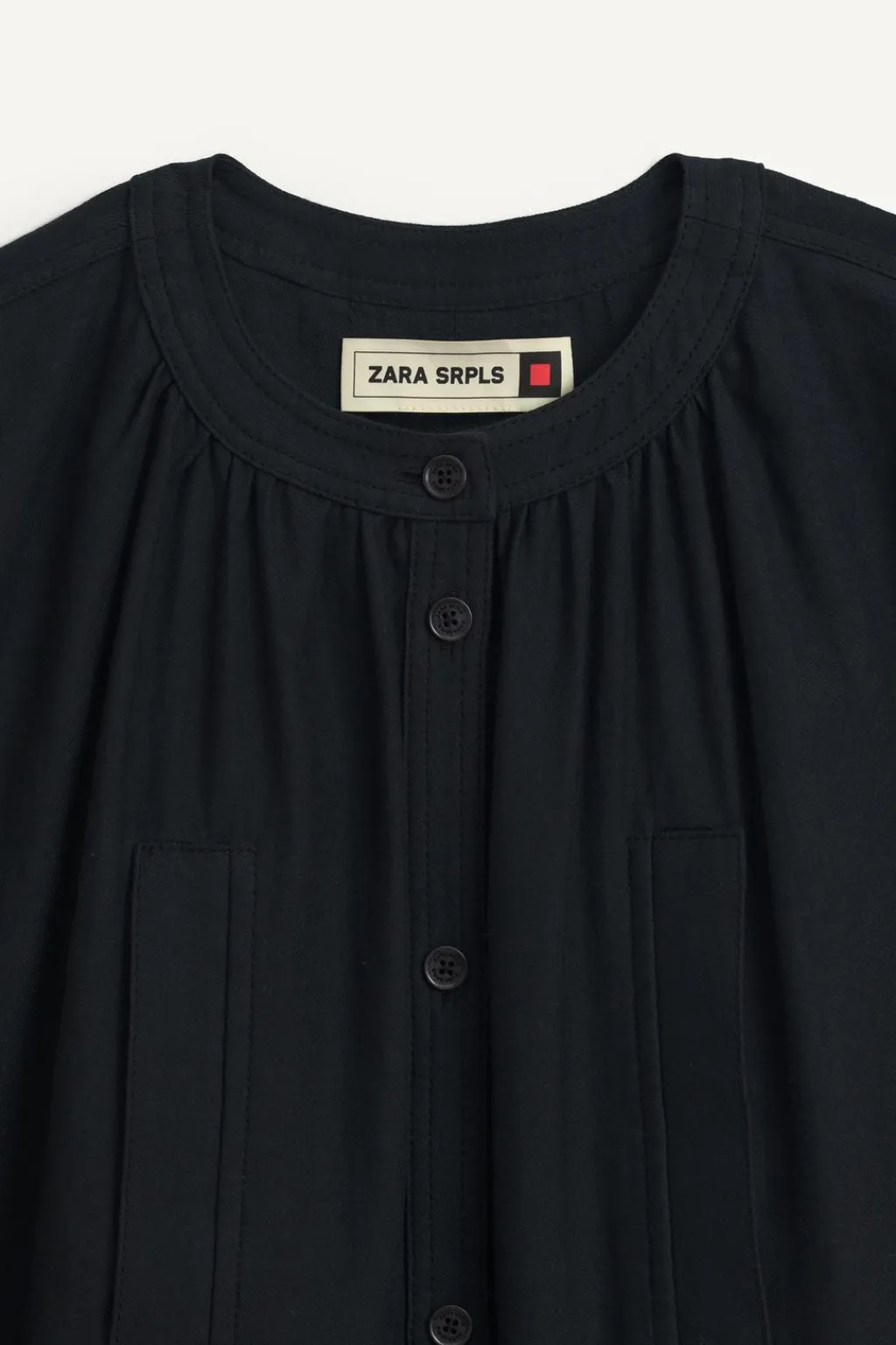 Camisa con cuello mao y manga larga acabada en cierre botón. Cierre de botonadura frontal. Bolsillos con detalle vivo en pechera. Detalle frunces en cuello y pliegue en espalda.