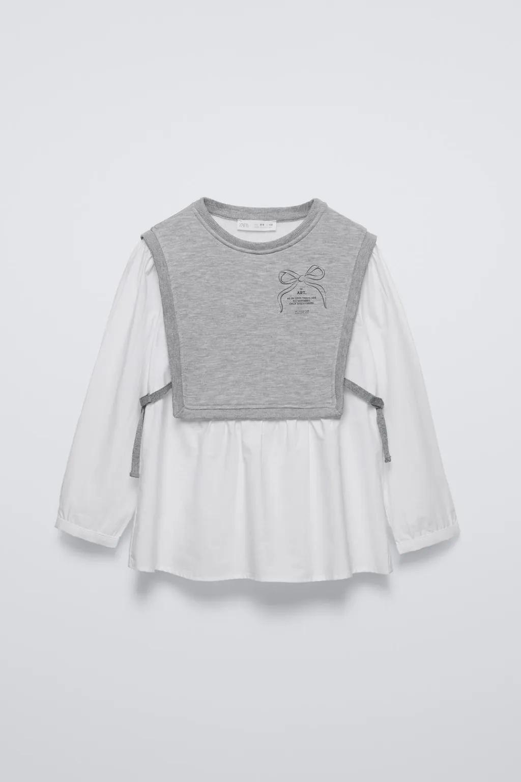Camisa con cuello redondo y manga larga acabada en cierre botón. Aplique lazos laterales. Detalle estampado lazo en pechera.