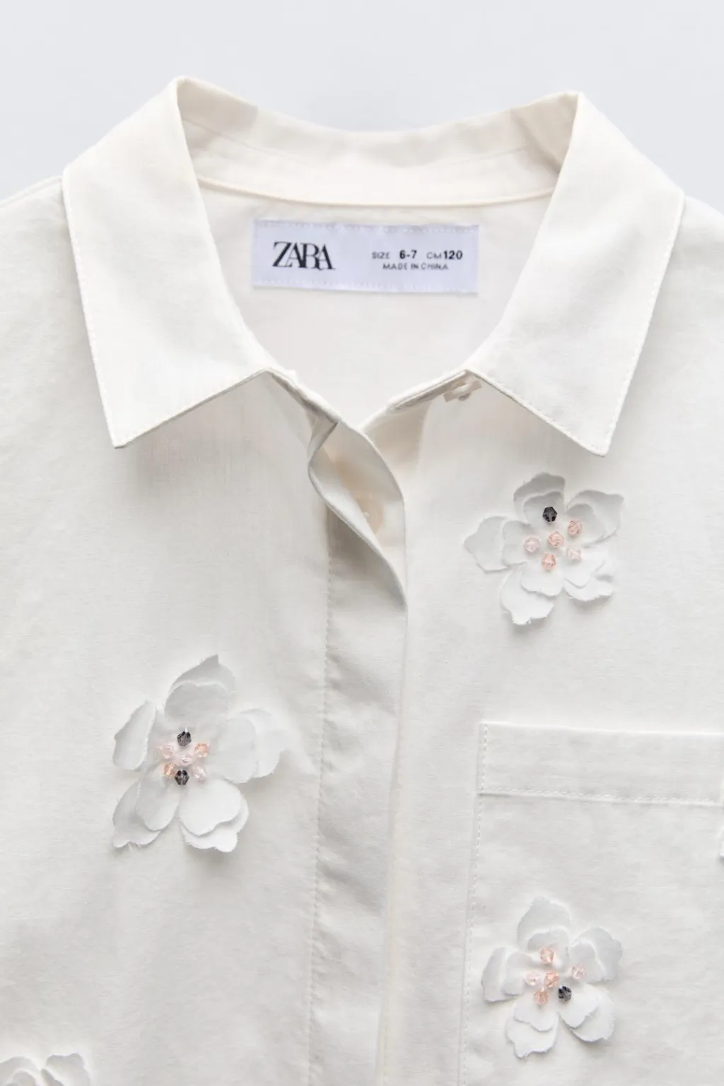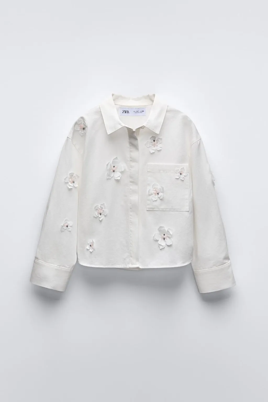 Camisa con cuello camisero y manga larga. Cierre botonadura frontal. Aplique flores 3D en delantero y mangas.