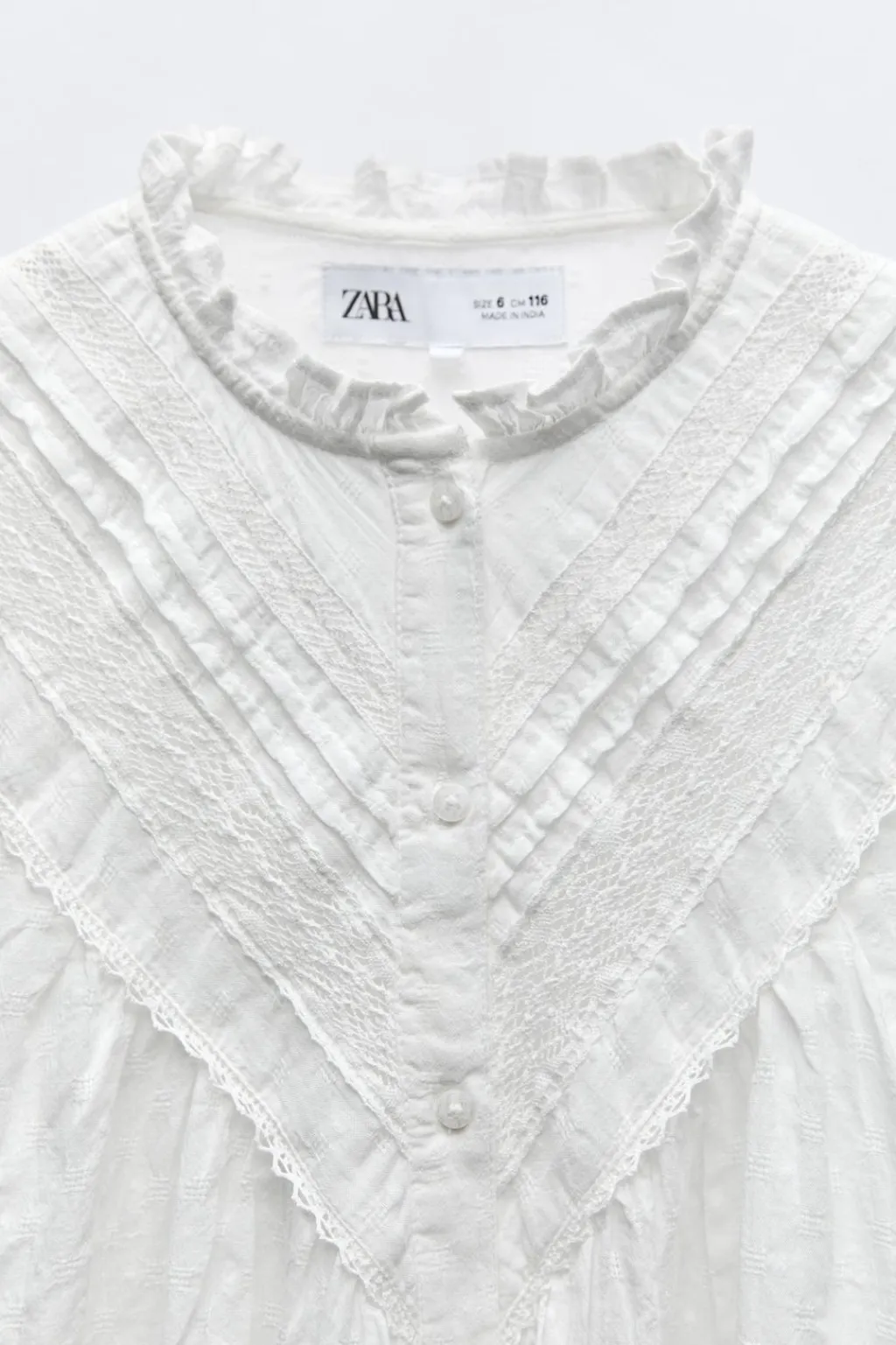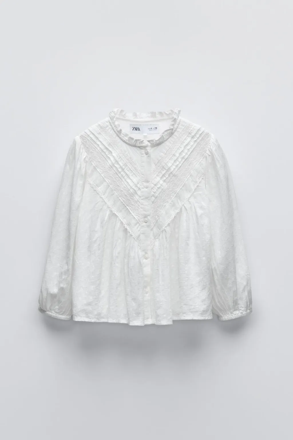 Camisa con cuello rizo y manga larga acabada en goma. Cierre con botonadura frontal. Detalle entredós en canesú.