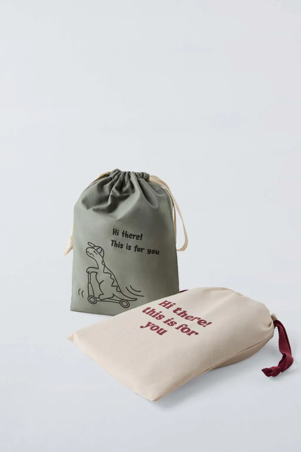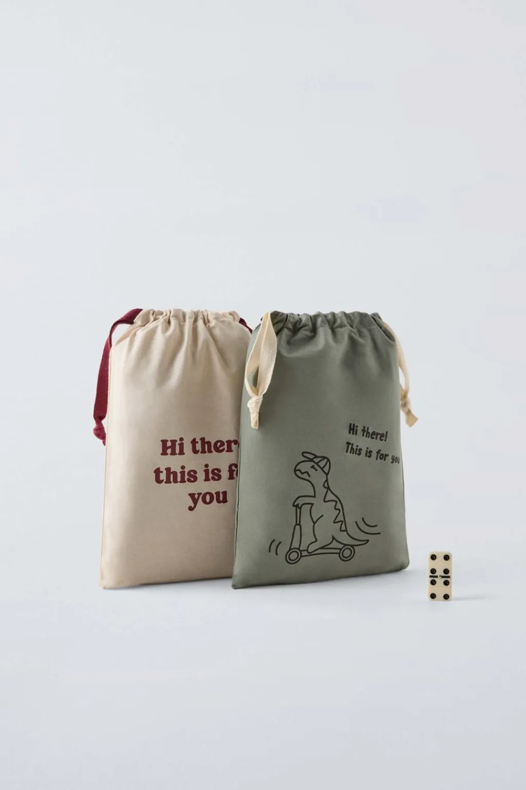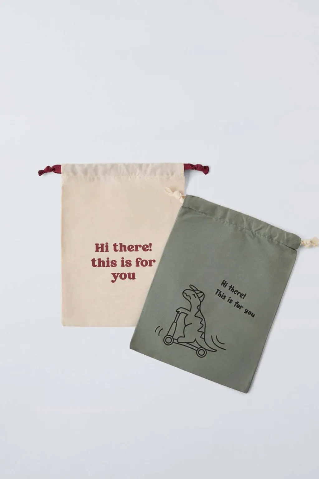 Pack de dos bolsas para guardar regalos. Cierre mediante cordones fruncidos.