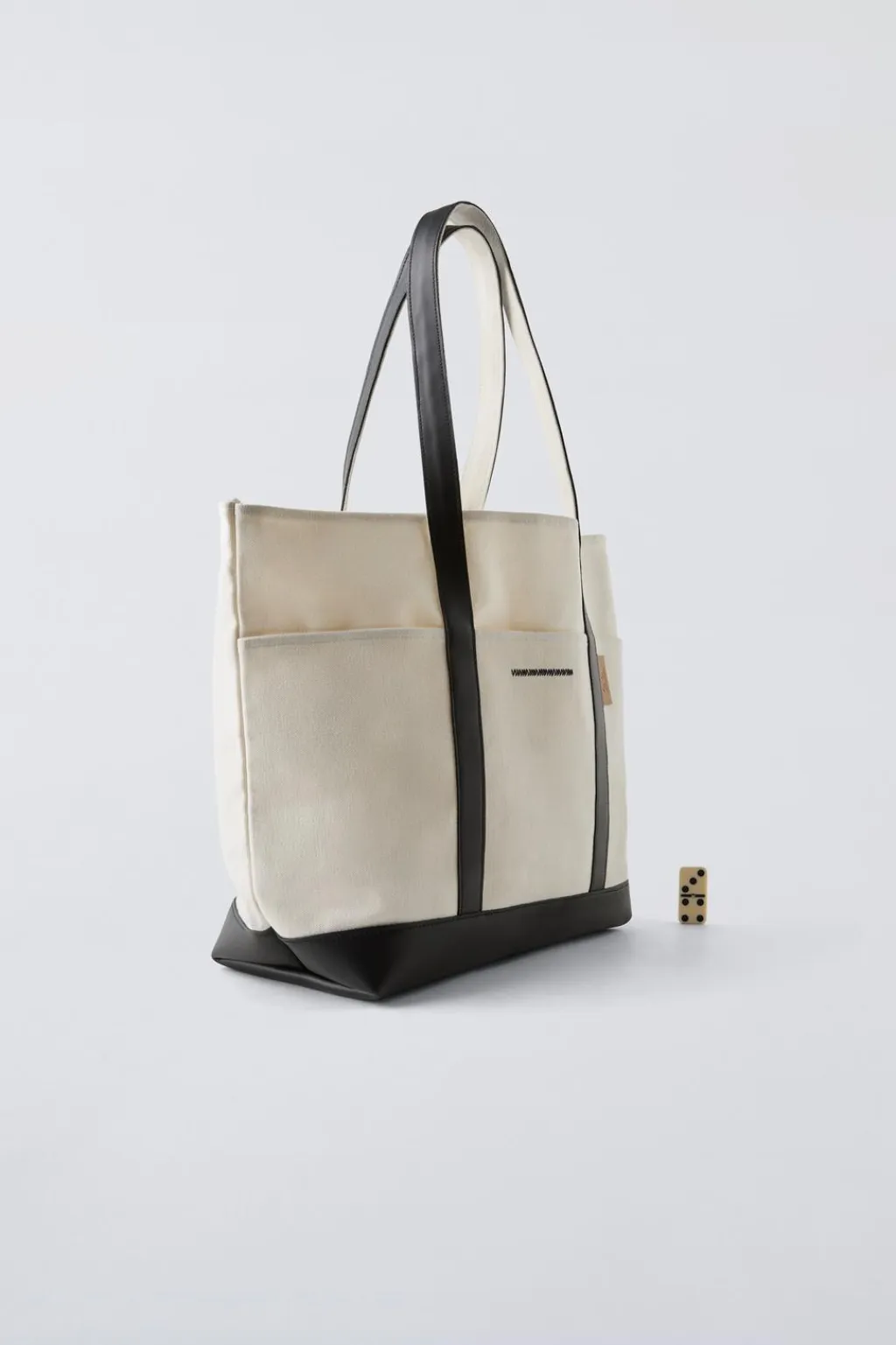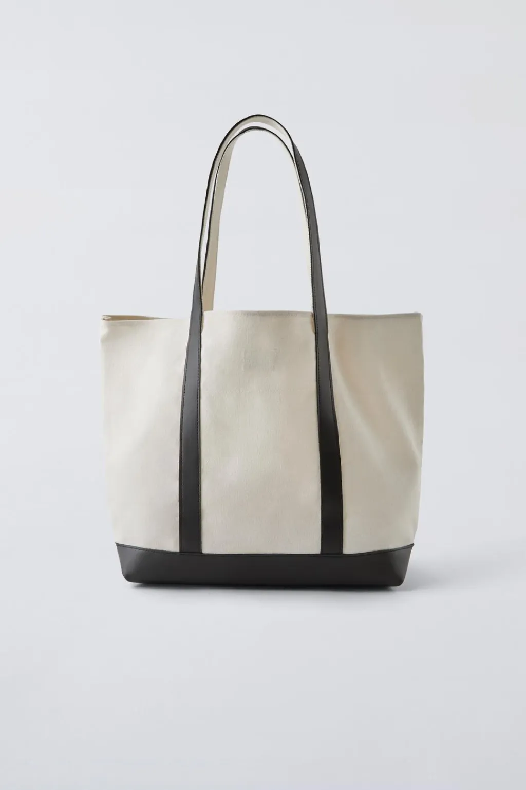Bolso tipo shopper con detalles en algodón y piel. Cuenta con un bolsillo central sin cierre. Doble asa de hombro.