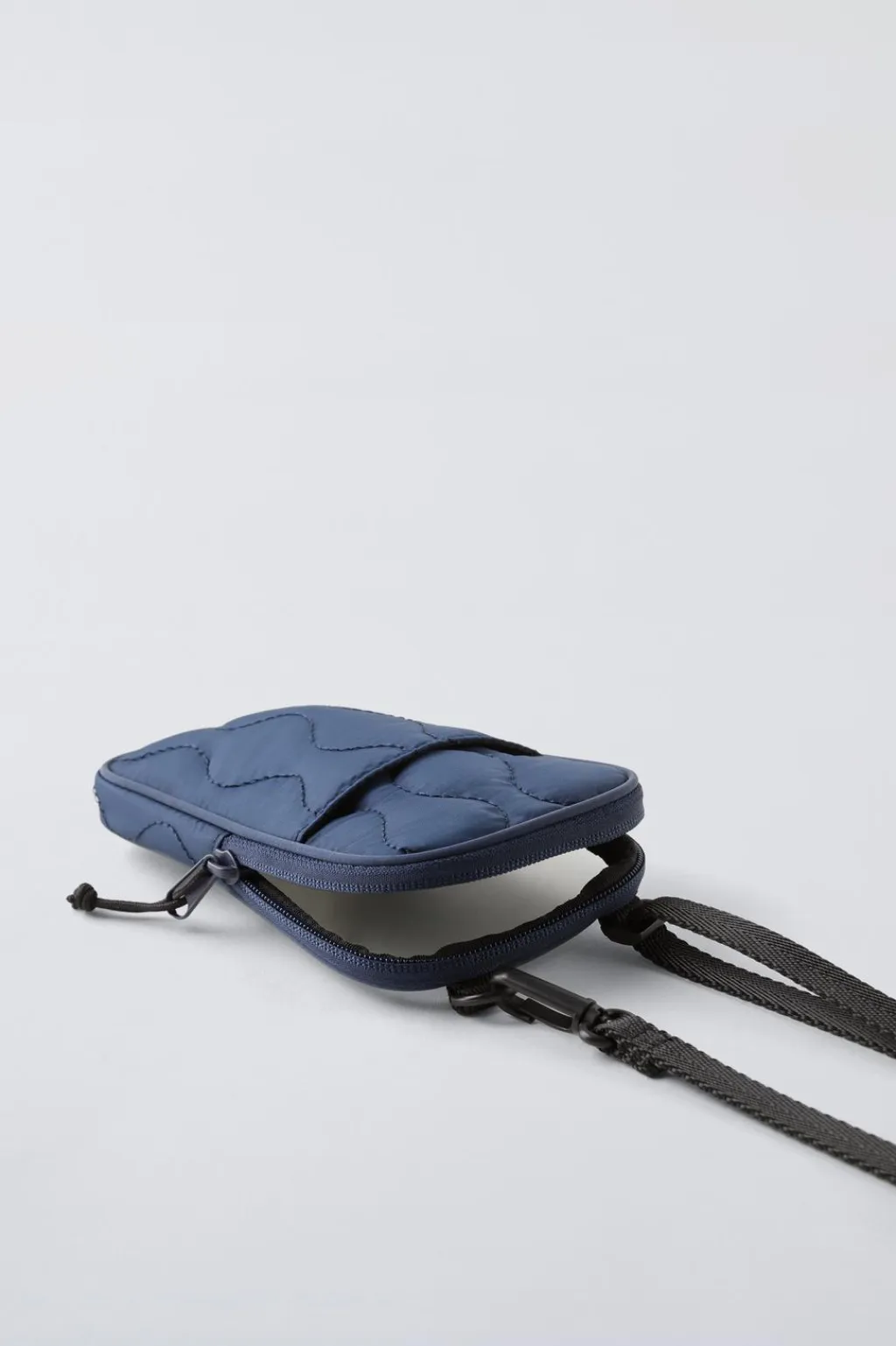 Bandolera tipo porta móvil padded. Compartimento principal con cierre mediante cremallera. Bolsillo adicional en la parte frontal sin cierre. Cuenta con pantalla táctil en la parte posterior. Asa de hombro ajustable y extraíble.
