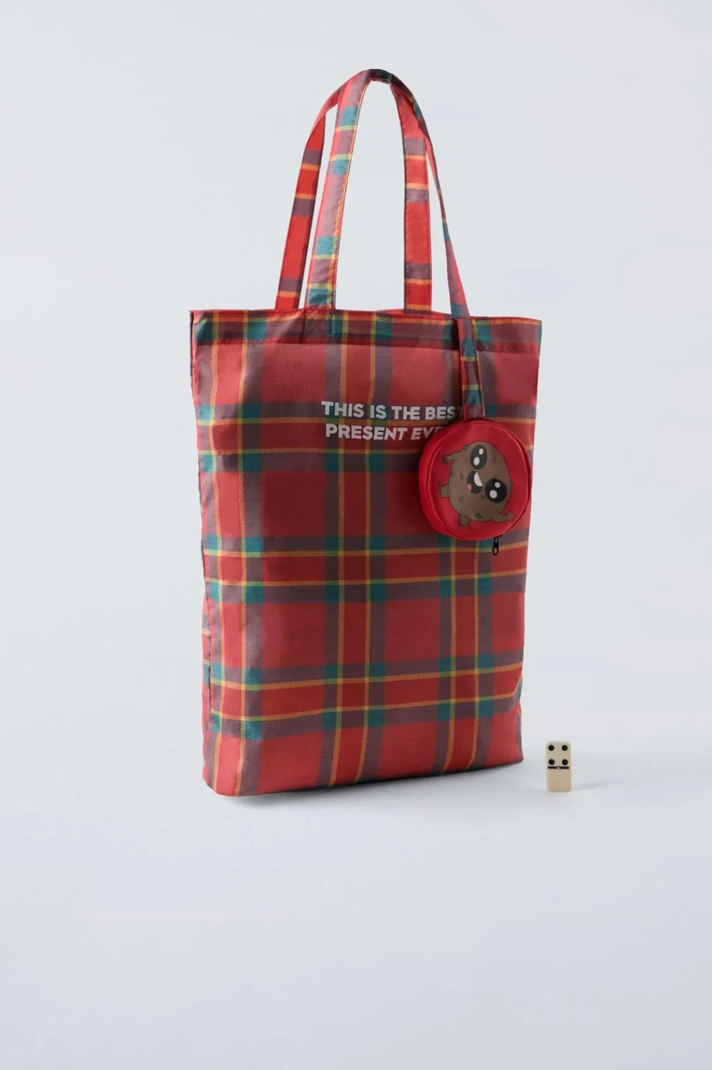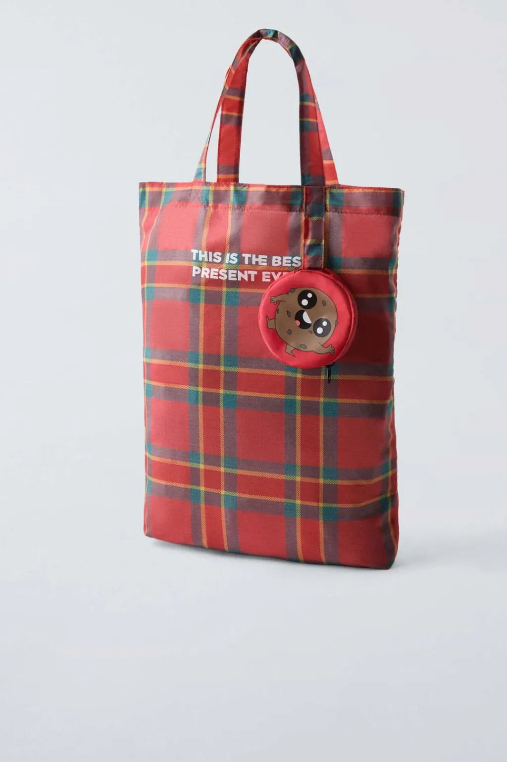 Bolso tipo shopper plegable convertible en charms – monedero con imagen cookie. El charm cuenta con un compartimento con cierre mediante cremallera. El shopper con estampado tartán cuenta con dos asas y sin cierre. tiene un stopper deportivo.