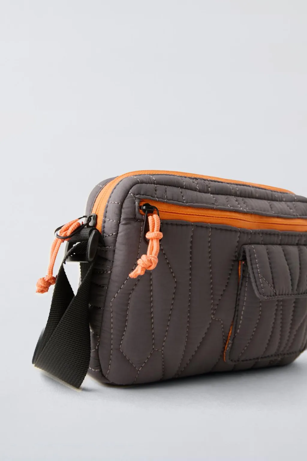 Bolso tipo bandolera acolchada. Compartimento principal con cierre mediante cremallera. Cuenta con un bolsillo frontal con cierre mediante cremallera y otro con cierre mediante tira adhesiva. Asa de hombro ajustable.