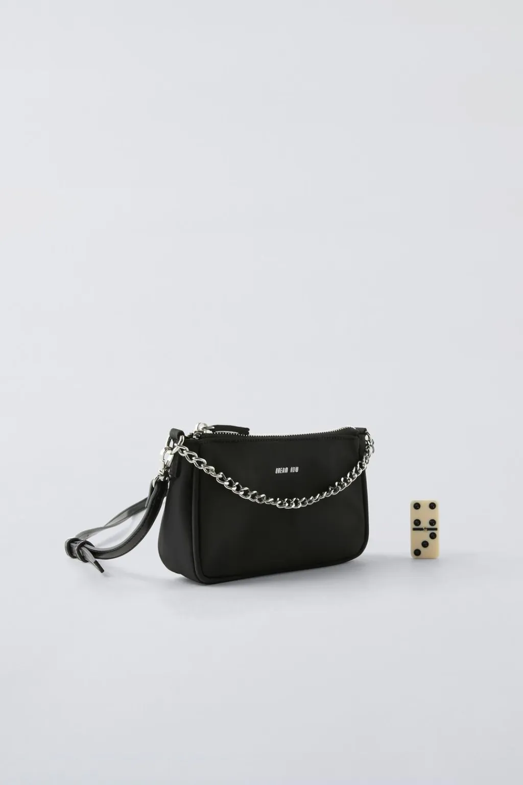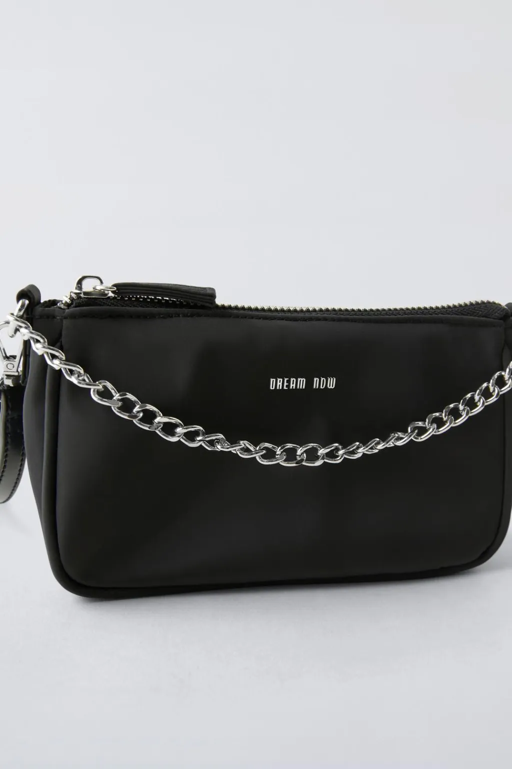 Bolso tipo bandolera con cadena. Cierre mediante cremallera. Asa de hombro ajustable y extraíble.