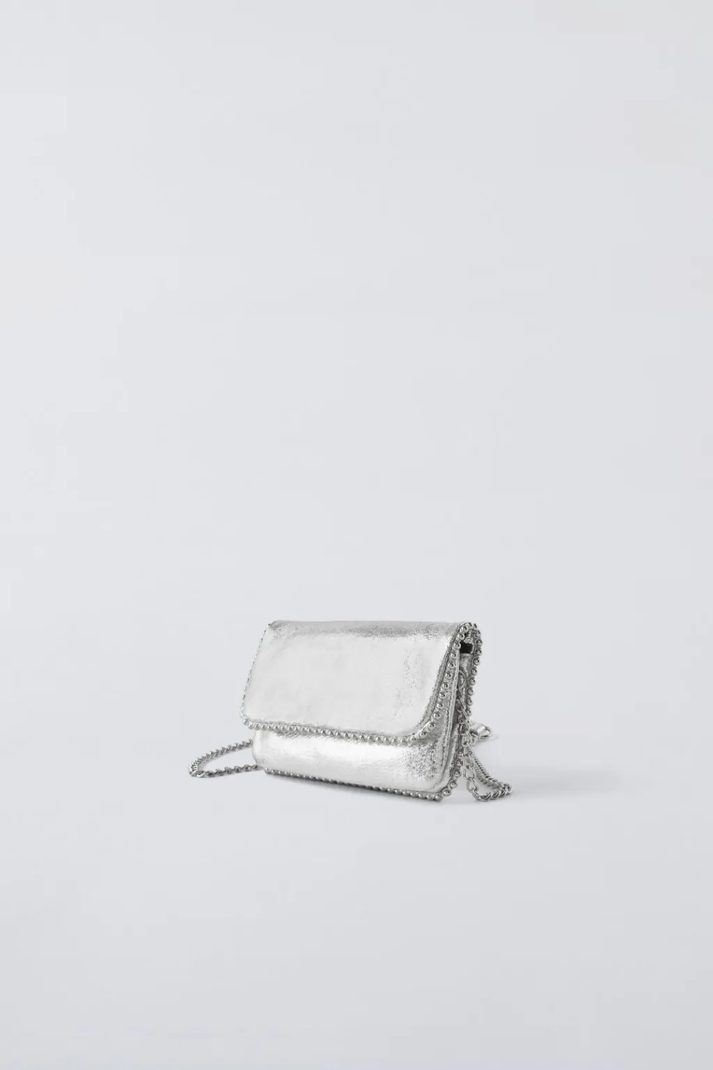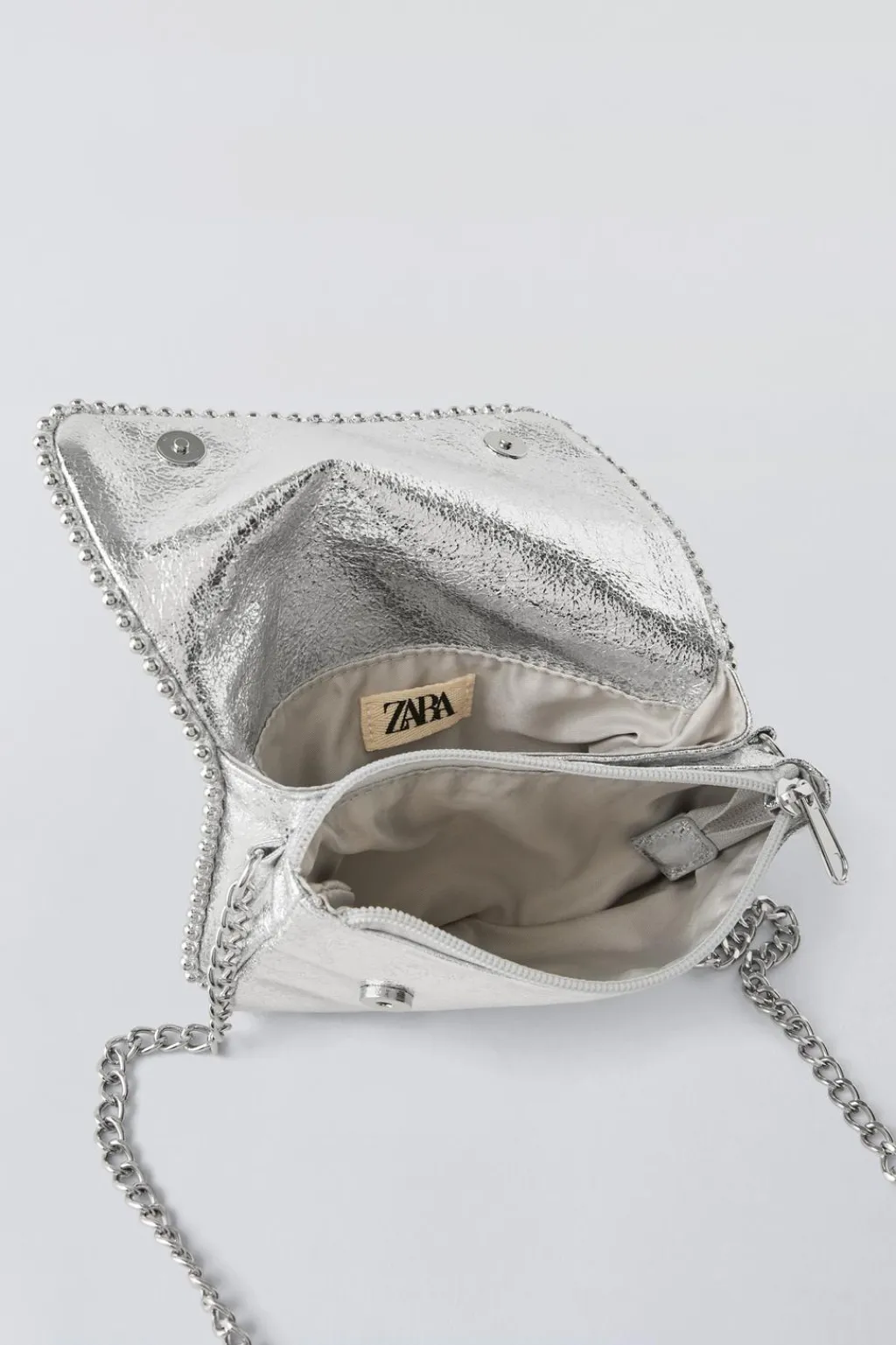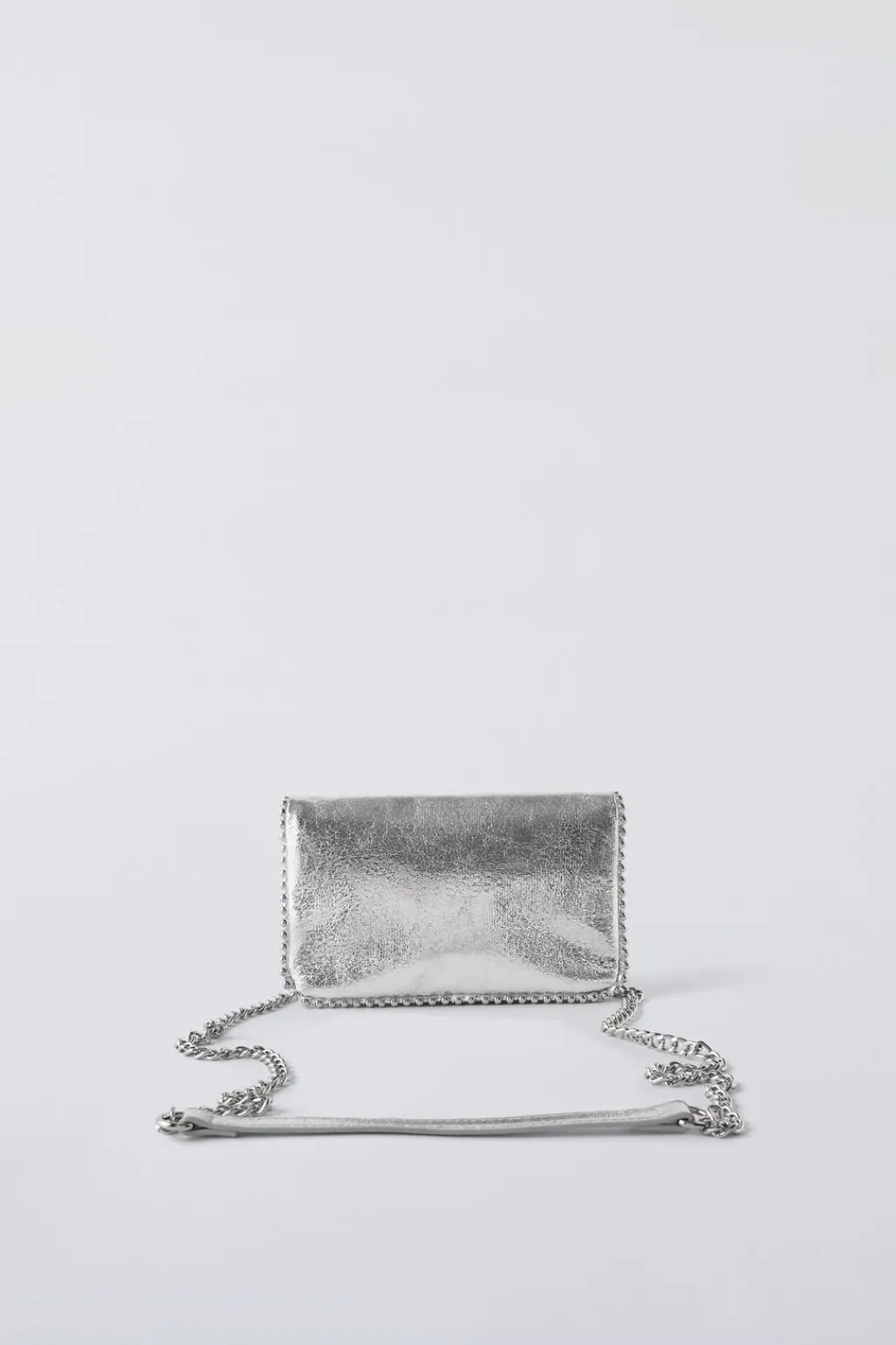 Bolso tipo bandolera metalizado. Compartimento principal tipo sobre con cierre mediante clip. Doble compartimento interior con cierre mediante cremallera. Asa de hombro en cadena.