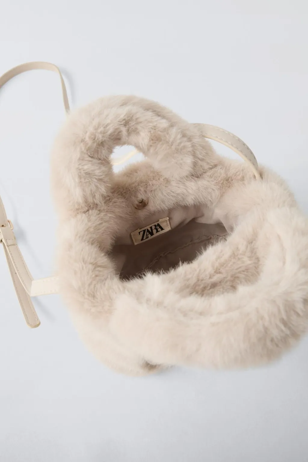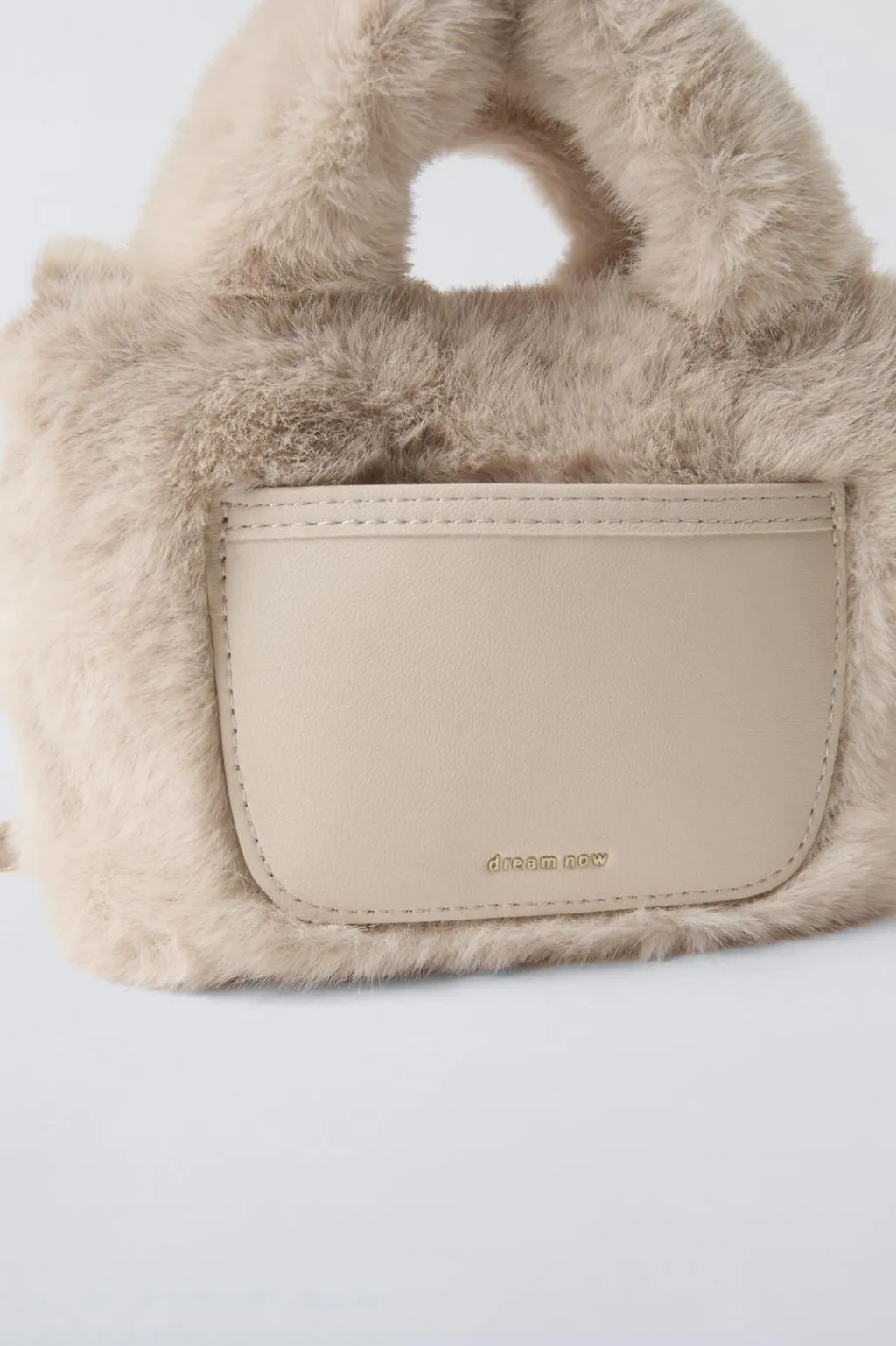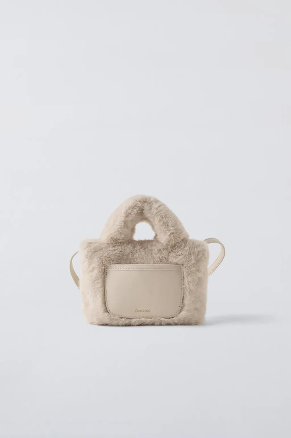 Bolso tipo bandolera neutra con pelo. Cierre mediante clip. Bolsillo frontal sin cierre. Doble asa de mano y asa de hombro ajustable.
