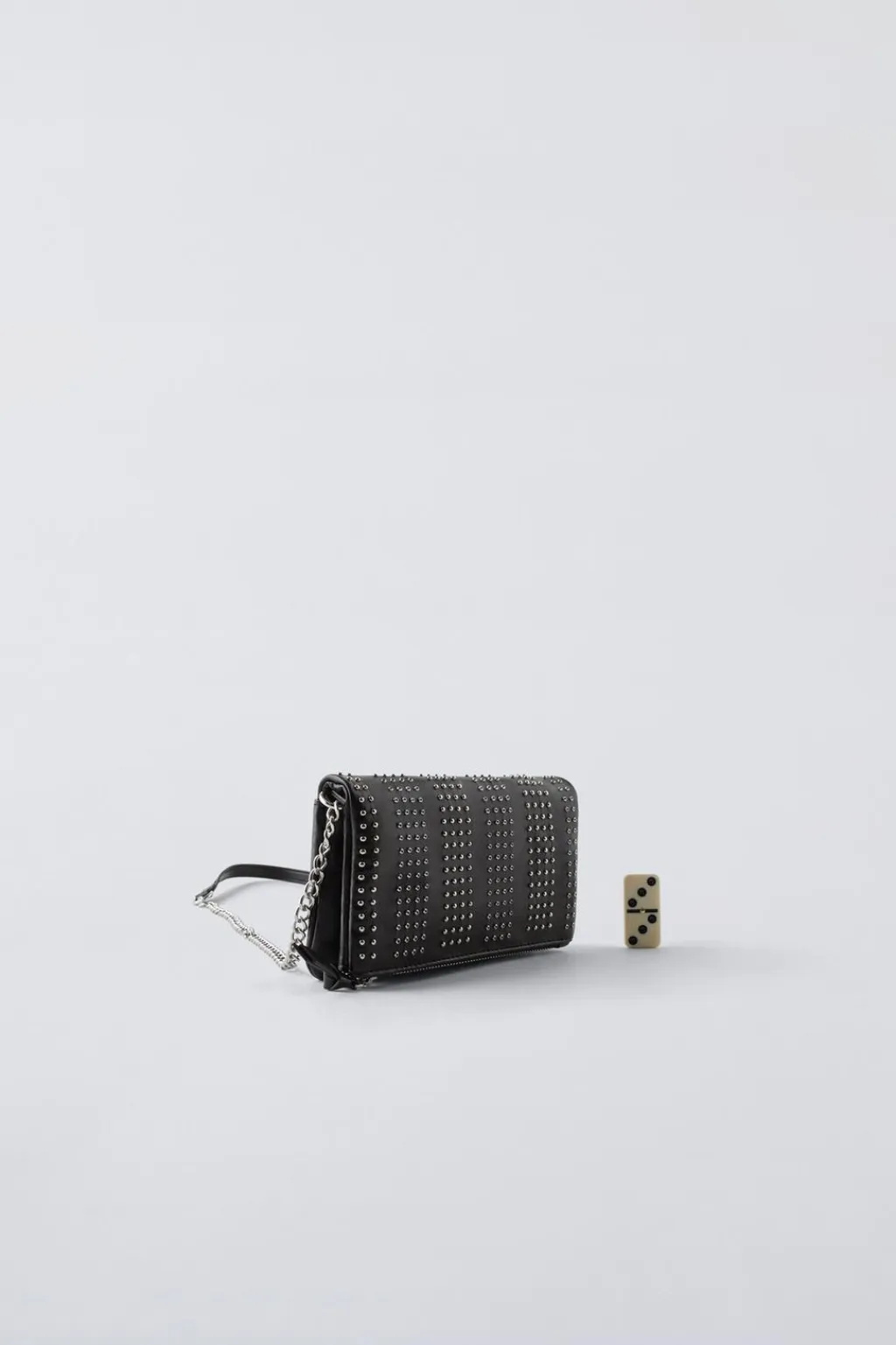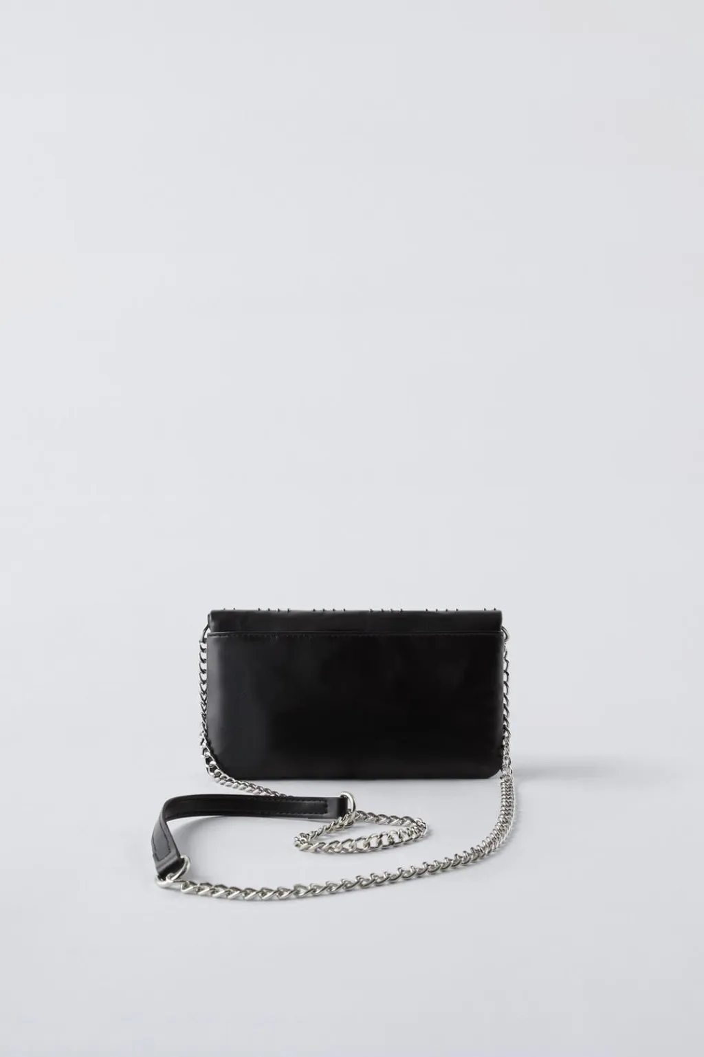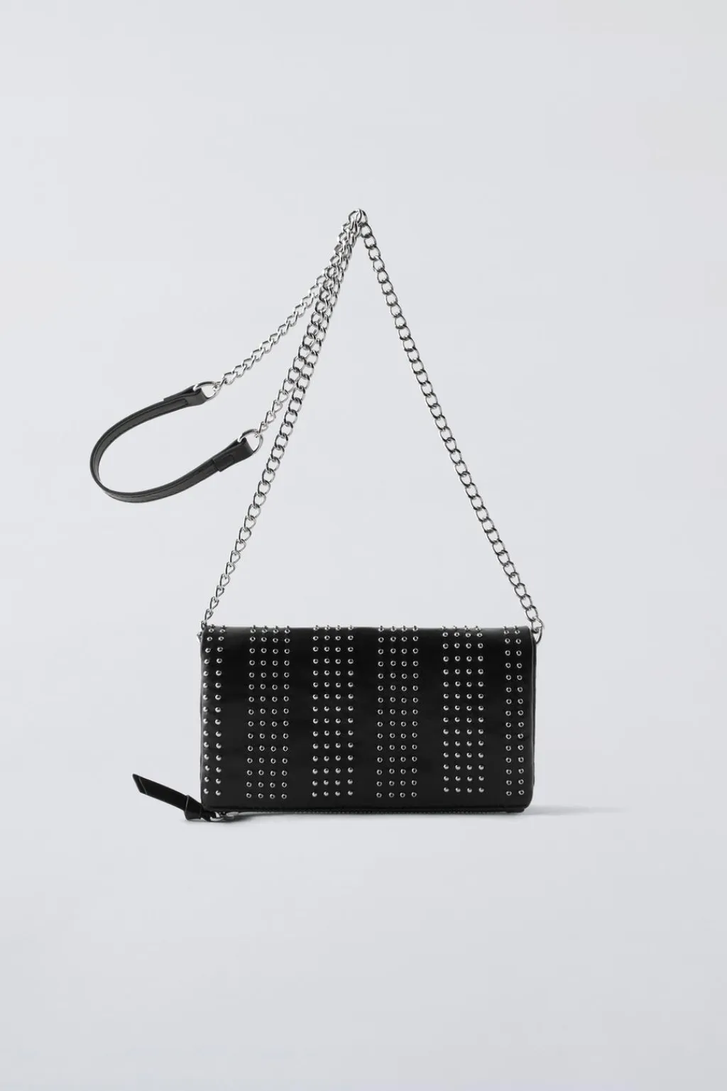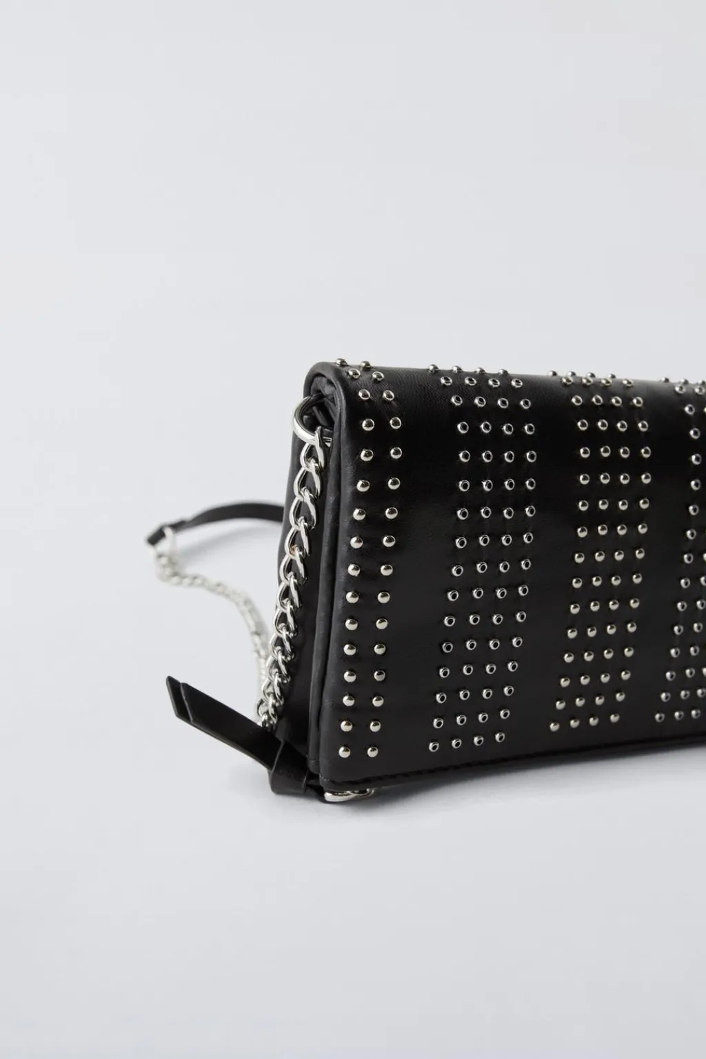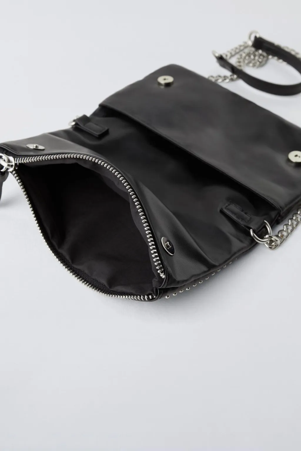 Bolso tipo bandolera con detalle tachas. Compartimento principal tipo sobre con cierre mediante doble clip. Compartimento interior sin cierre y compartimento exterior con cierre mediante cremallera. Asa de hombro en cadena.