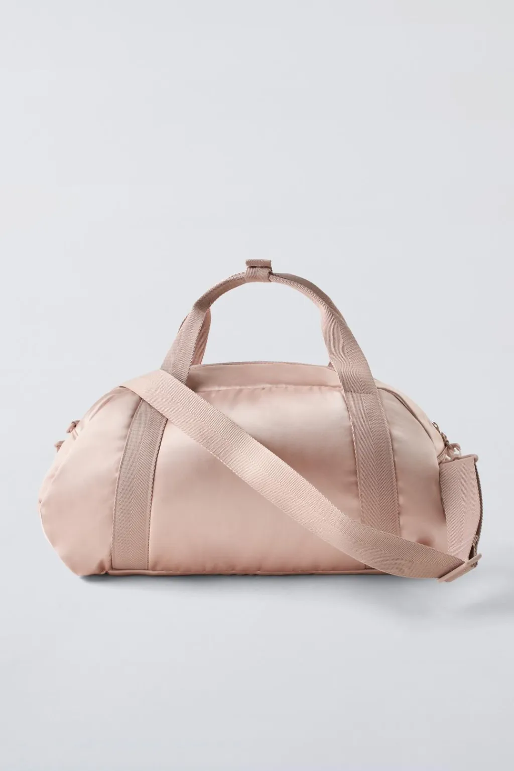 Bolso tipo bowling ballet. Compartimento principal con cierre mediante cremallera. Cuenta con un bolsillo frontal con cierre mediante cordón elástico. En el interior contiene dos bolsillos sin cierre y un bolsillo con cierre mediante cremallera . Doble asa de mano y asa de hombro ajustable y extraíble.