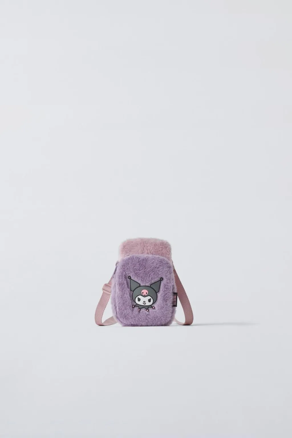 Funda porta móvil formato bandolera con pelo KUROMI © SANRIO. Compartimento principal con cierre mediante cremallera. Bolsillo adicional en la parte frontal con cierre mediante cremallera. Cuenta con pantalla táctil en la parte posterior. Asa de hombro ajustable y extraíble.