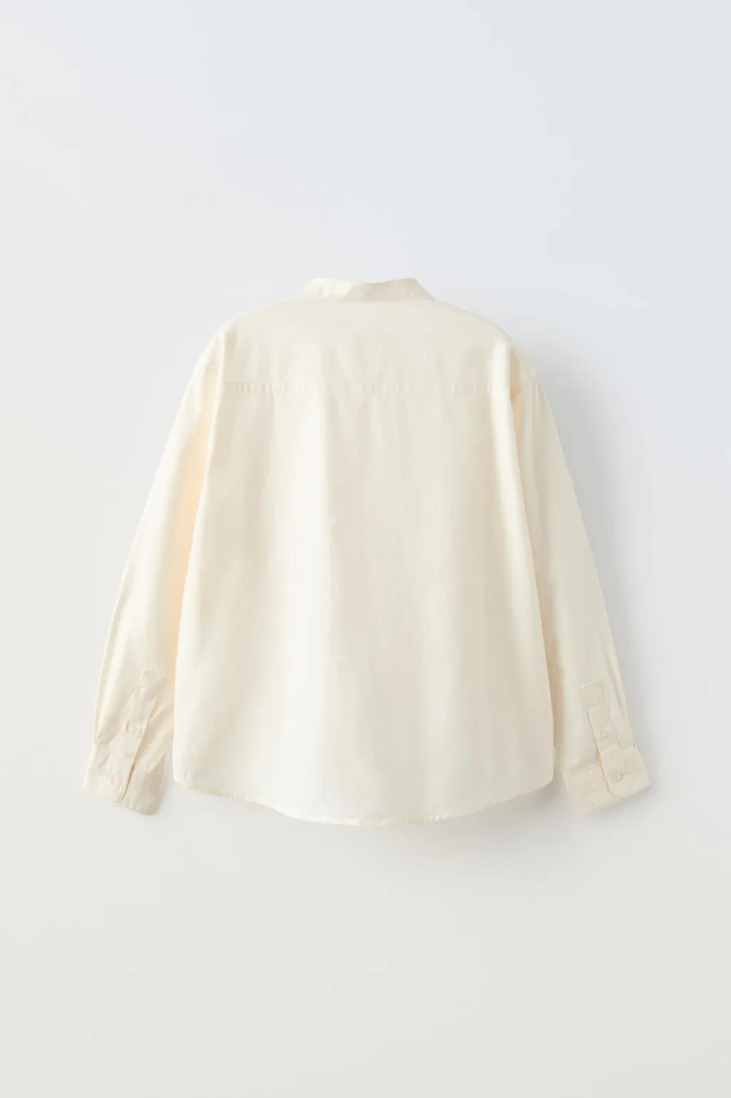 Camisa con cuello mao y manga larga. Cierre botonadura frontal. Bolsillo de tipo plastrón en pechera.
