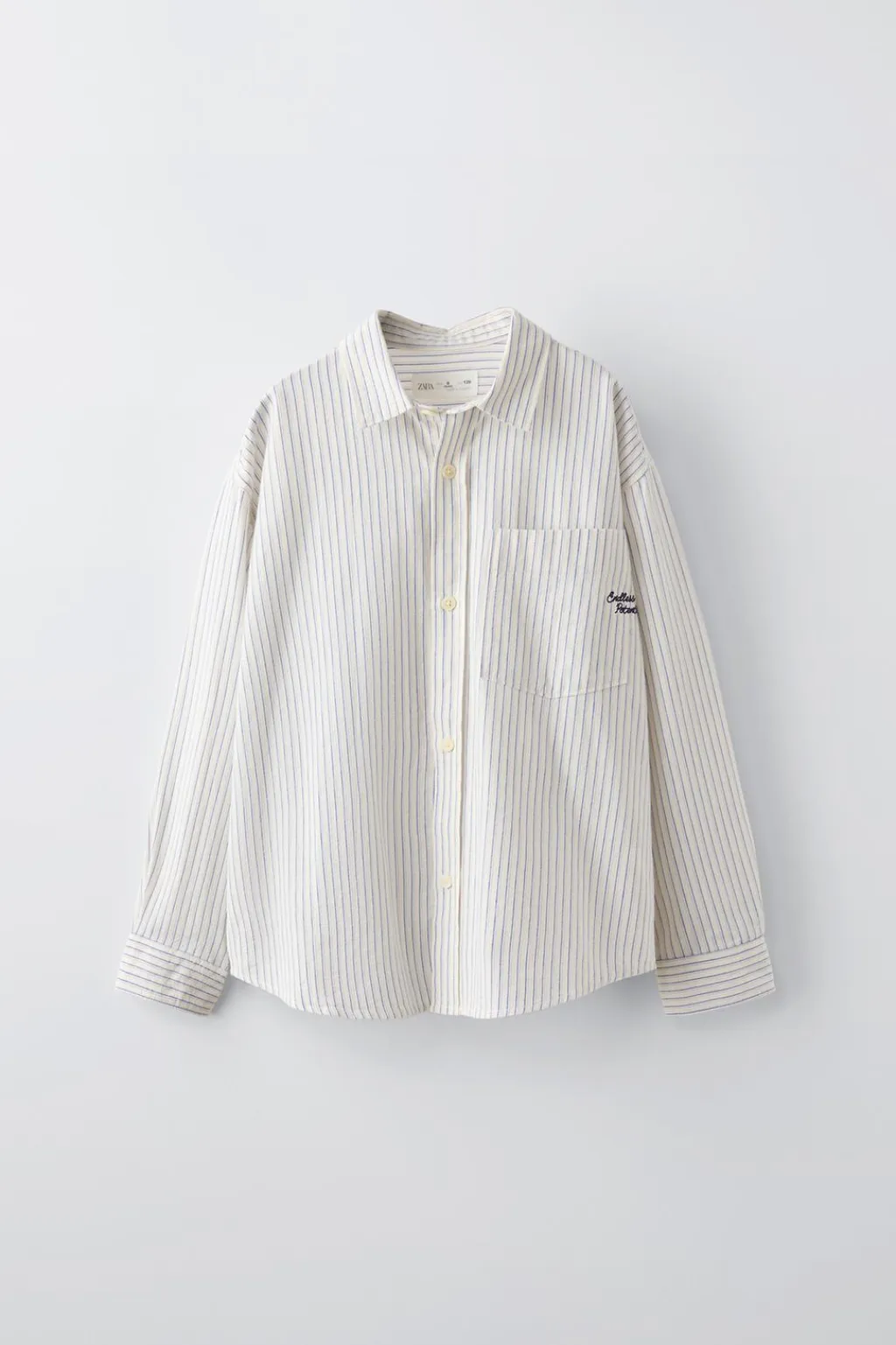 Confeccionada en un tejido oxford 100% algodón y patrón holgado. Con cuello tipo camisero y manga larga con abertura y cierre botón en puño. El cierre es frontal con botones color a tono. Tiene un bolsillo tipo plastrón en la pechera y un detalle te texto bordado.