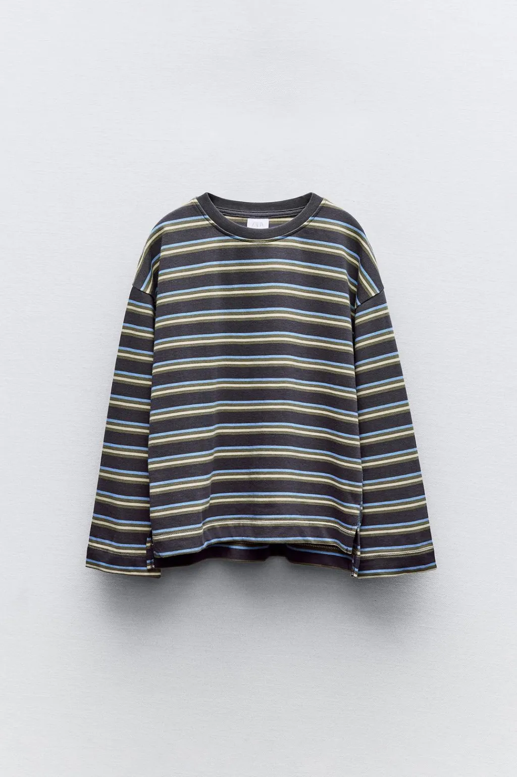 Camiseta con cuello redondo y manga larga. Detalle aberturas en laterales del bajo.