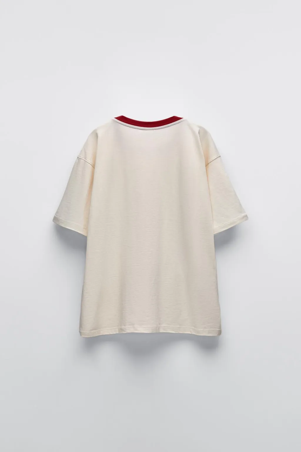 Camiseta con cuello redondo y manga corta con detalle banda en color a contraste en hombros Bordado texto en pechera.