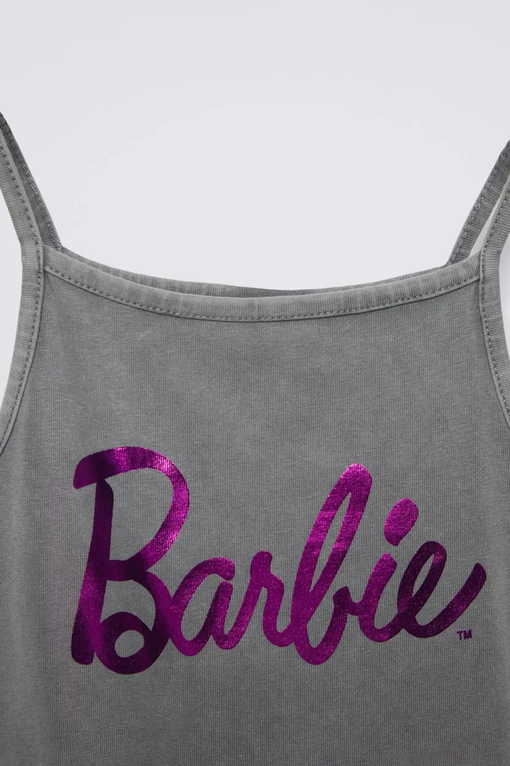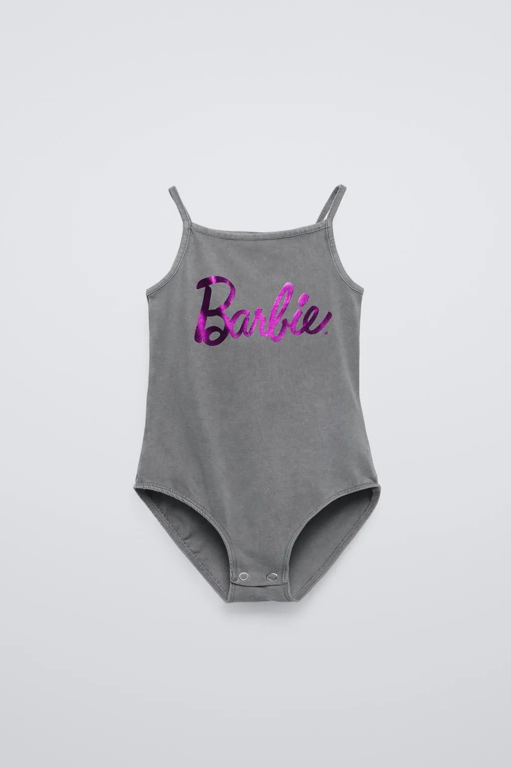 Body con cuello redondo y tirantes. Bajo con cierre botones de tipo presión. Estampado BARBIE™ MATTEL con brillo en delantero.