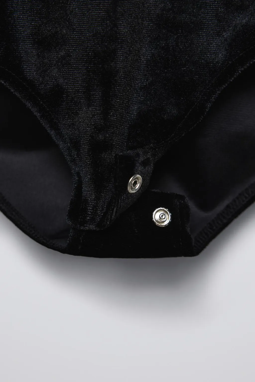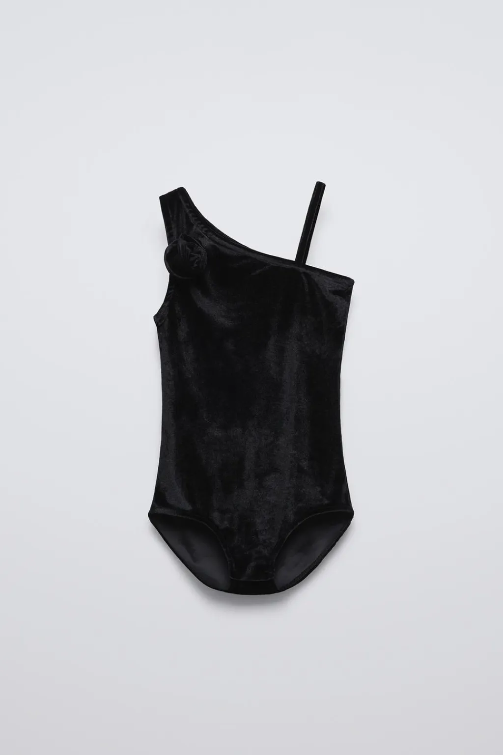 Body con cuello asimétrico y tirantes. Aplique flor en pechera. Bajo acabado en cierre botones presión. Tejido velvet suave.
