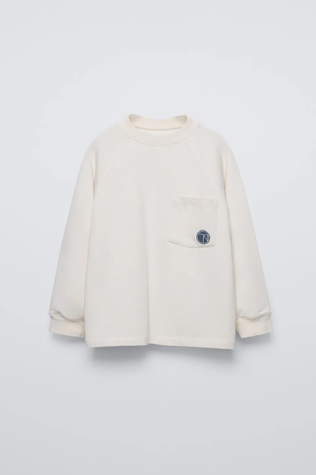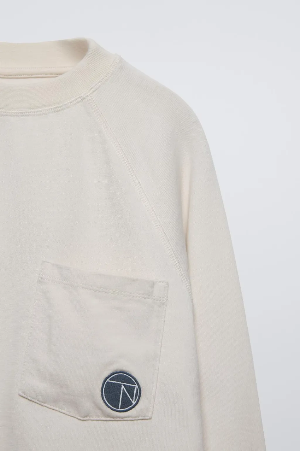 Camiseta con cuello redondo y manga larga acabada en puño. Bolsillo de tipo plastrón en pechera con detalle bordado.