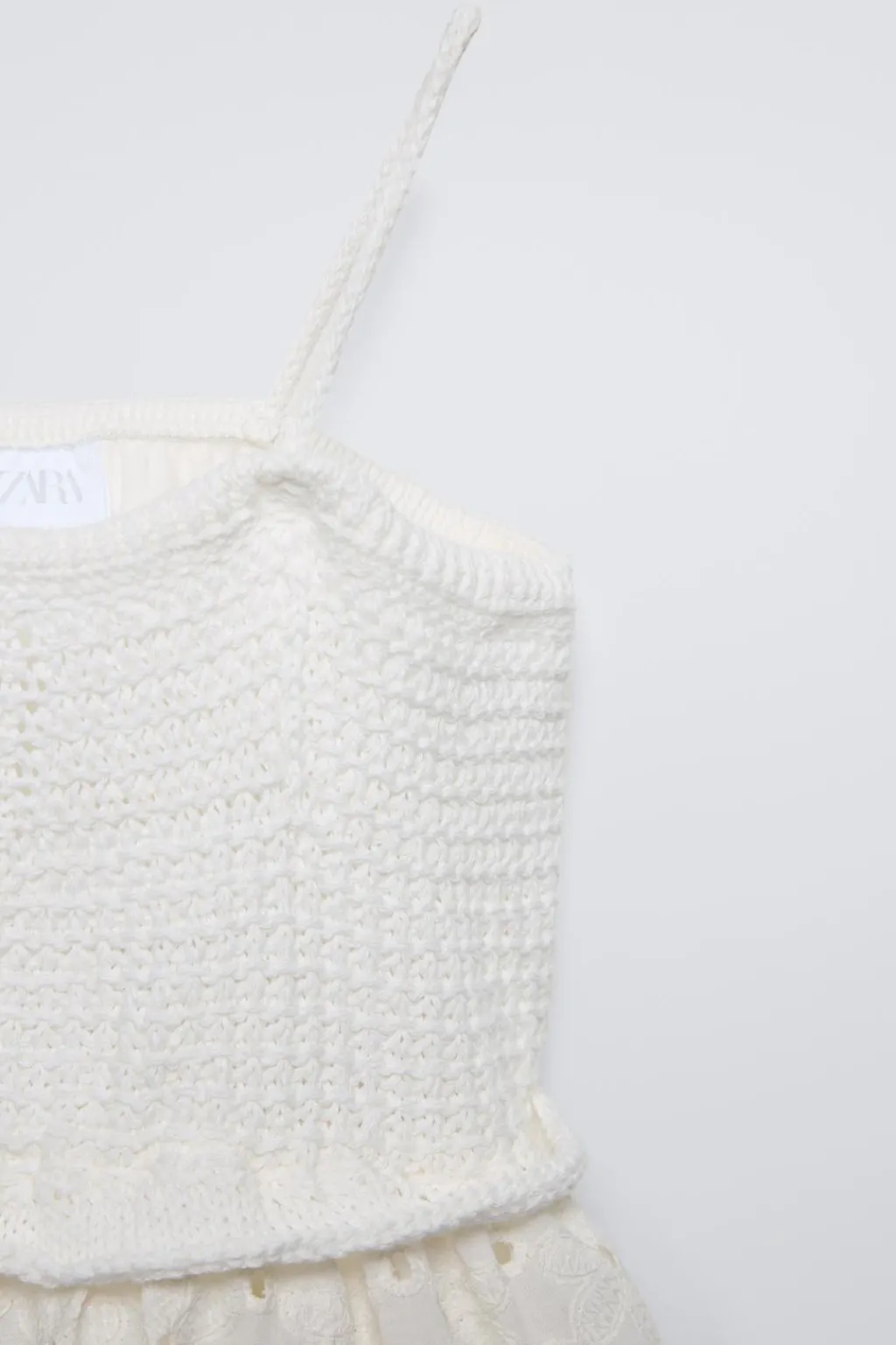 Camiseta con cuello redondo y tirantes con crochet en pechera. Detalle cut out en espalda y bajo acabado con flores bordadas.