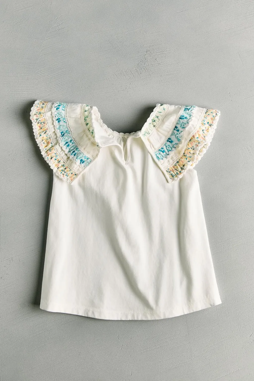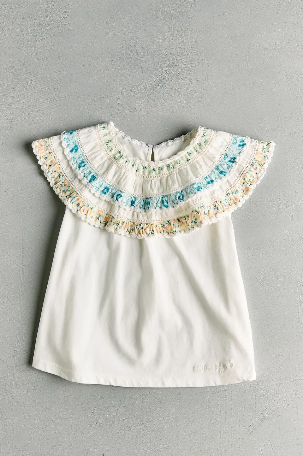 Cuello babero en tejido combinado con diferentes estampados florales y detalle acabados en crochet. Cierre tipo lágrima con botón en la espalda y SEA NEW YORK bordado a tono en bajo.