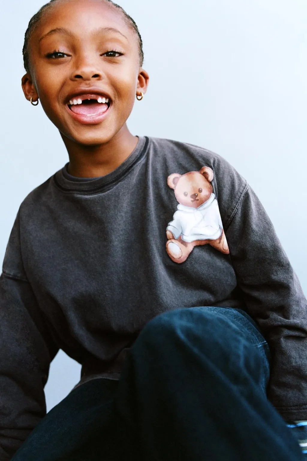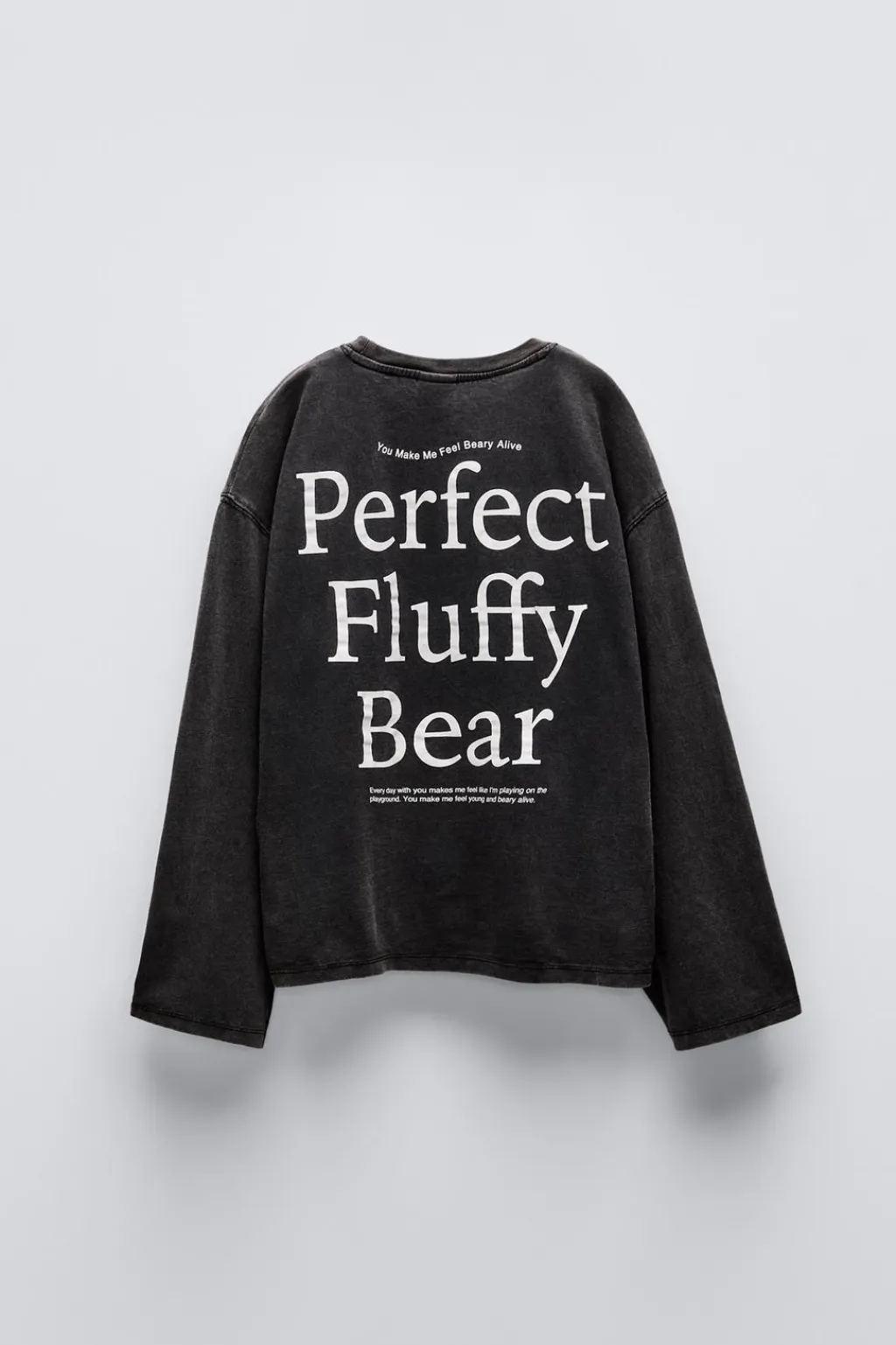 Camiseta con cuello redondo y manga larga. Estampado motivo oso en pechera y texto en espalda.