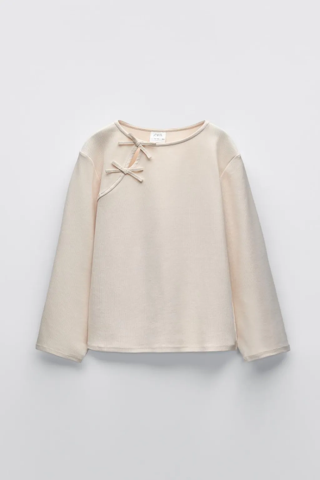 Camiseta con cuello redondo y manga larga. Detalle cut out con aplique lacitos en pechera.