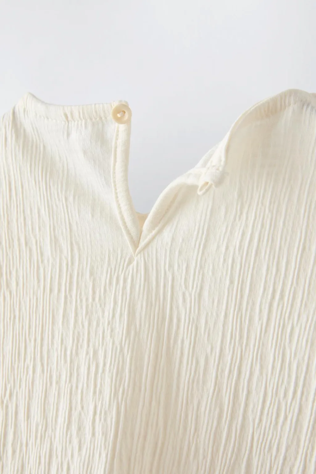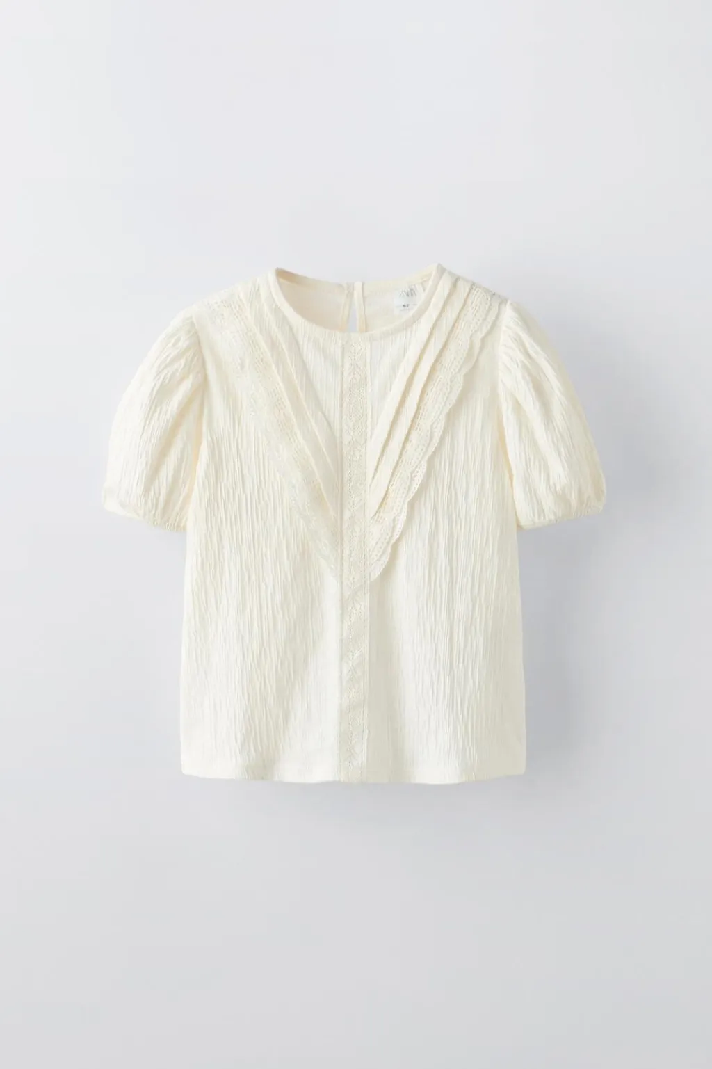 Camiseta con cuello redondo y manga corta acabada en goma. Cierre tipo lágrima con botón en espalda. Detalle entredós en pechera.