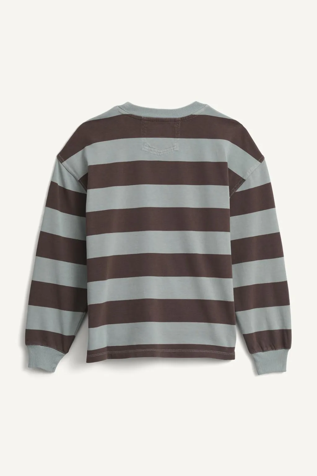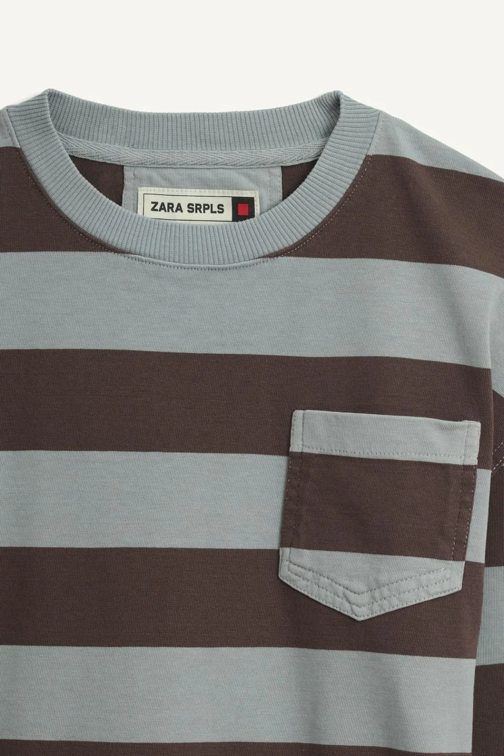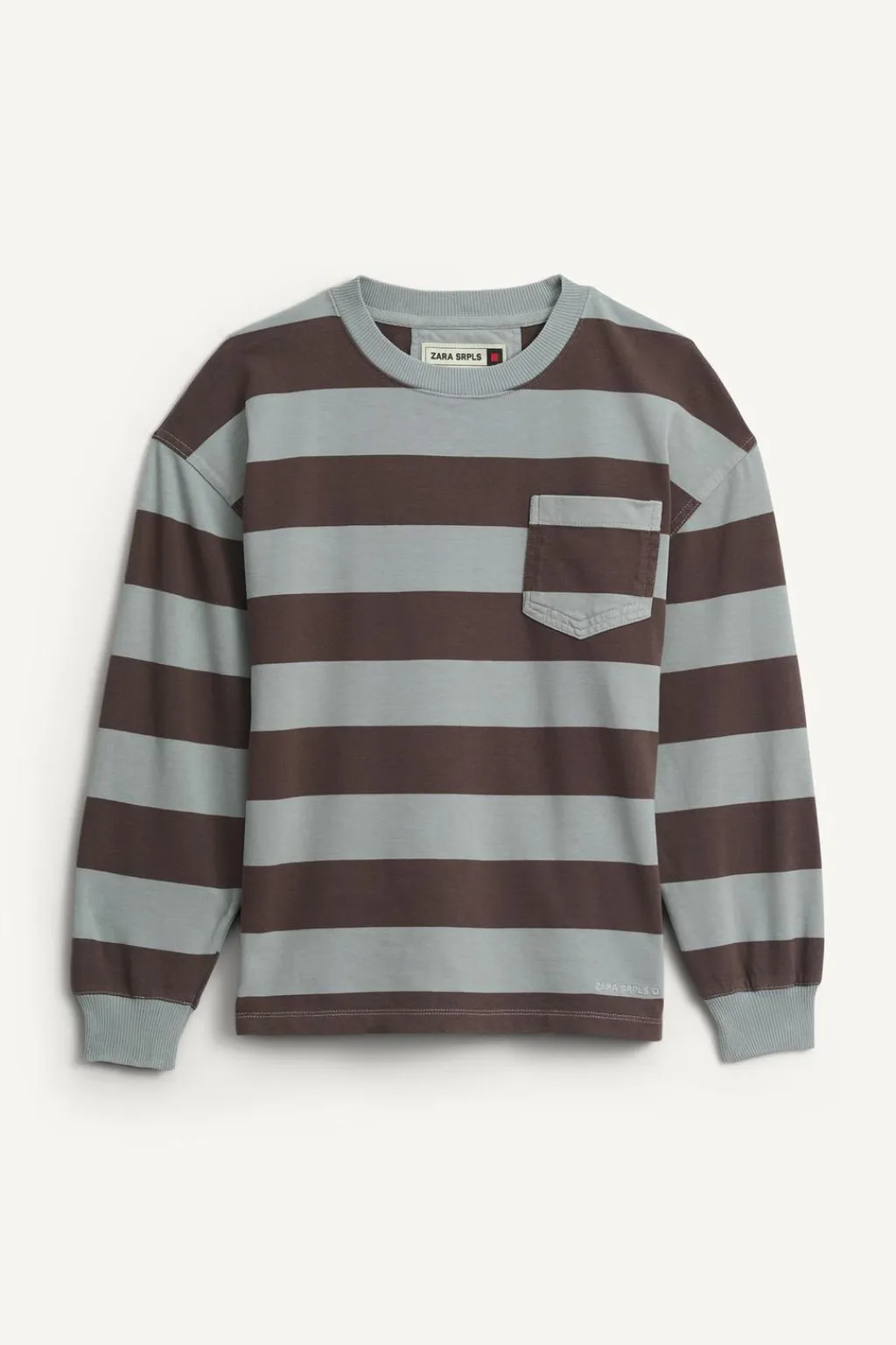 Camiseta de algodón con estampado de raya tejida. Con cuello redondo y manga larga acabada en puño. Bolsillo de tipo plastrón en pechera. Detalle texto bordado en bajo combinado a tono.