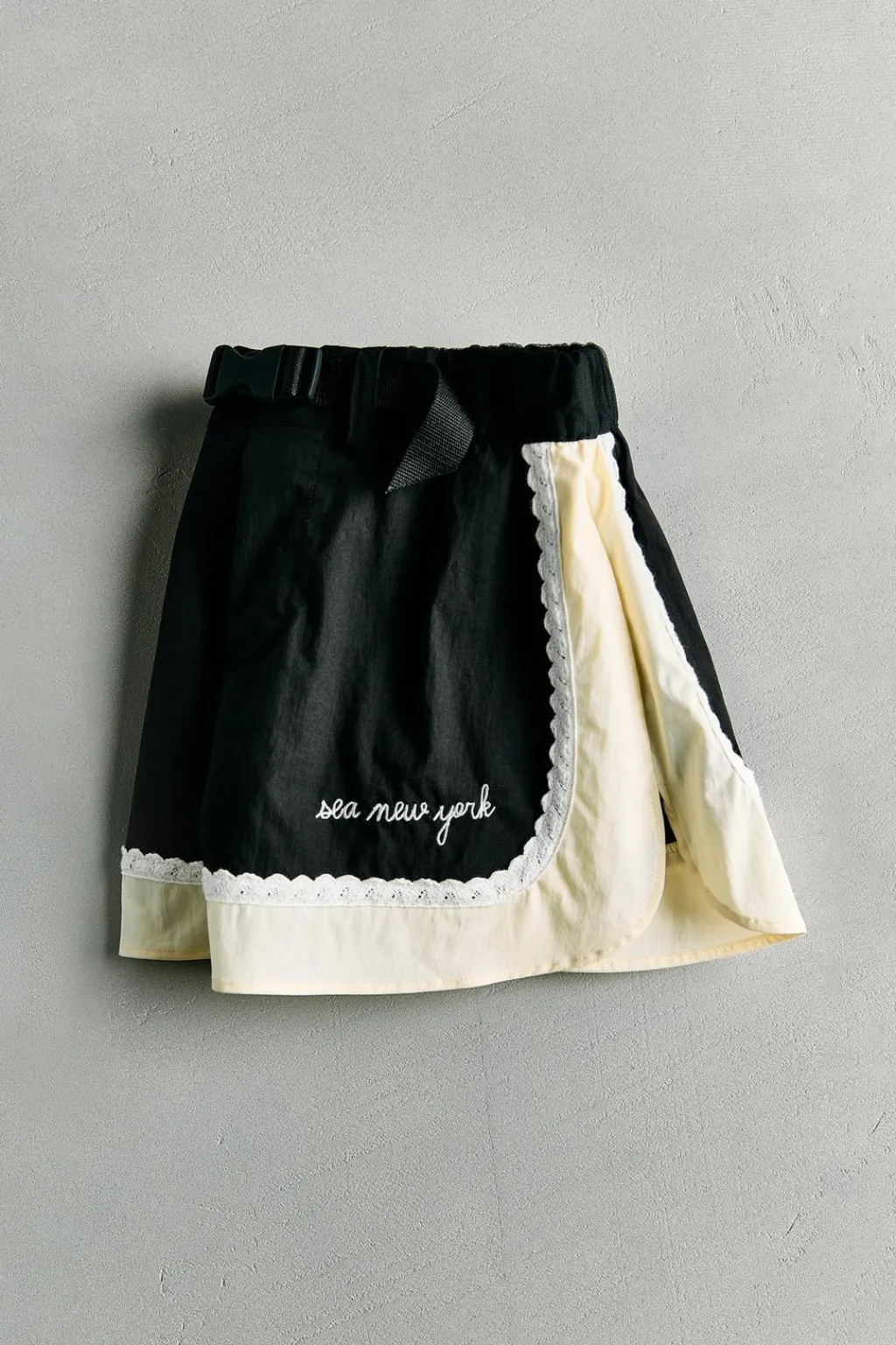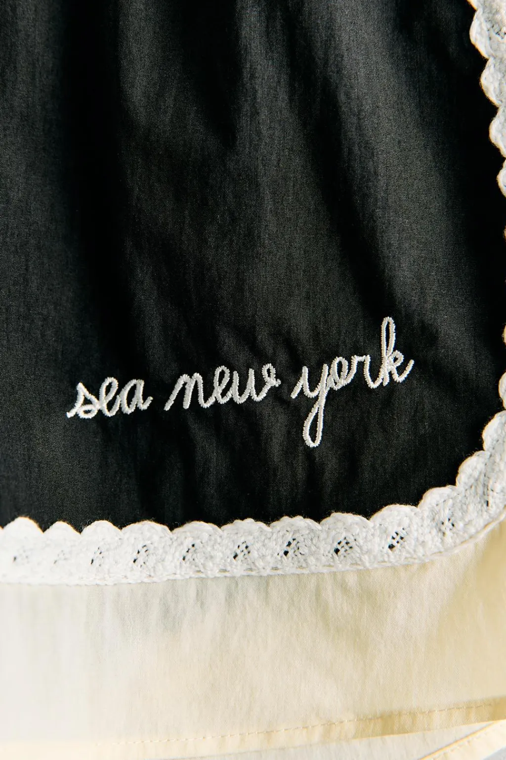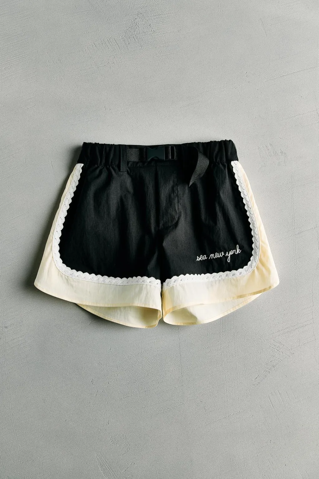 Cinturilla elástica con detalle de tul y aplique frontal de hebilla tipo presión. Bolsillos en laterales. Detalle banda color a contraste con aplique crochet en laterales y bajo. Texto SEA NEW YORK bordado en delantero.