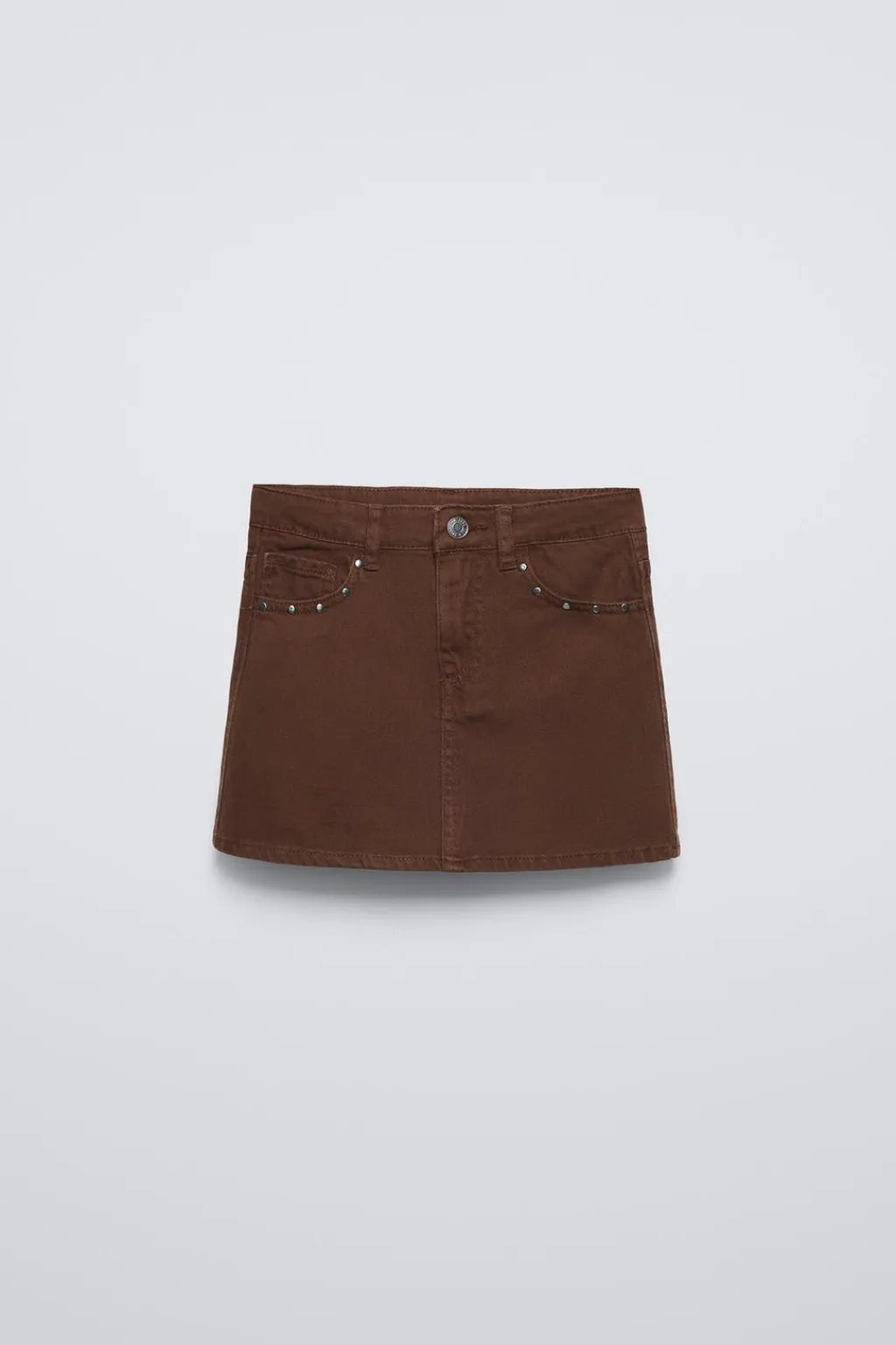 Falda con cinturilla interior ajustable y cierre botón frontal. Bolsillos delanteros y aplique tachas.