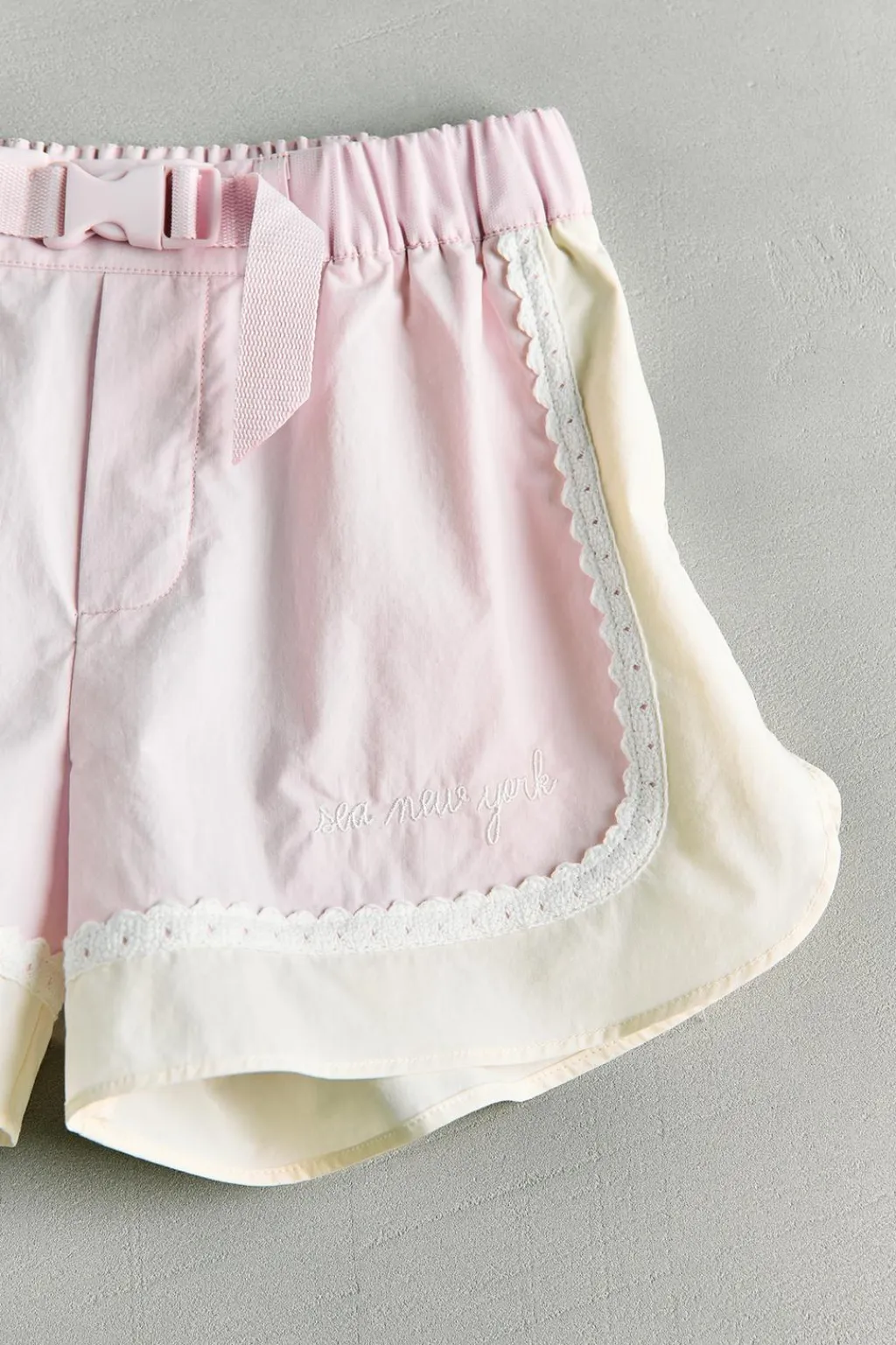 Cinturilla elástica con detalle de tul y aplique frontal de hebilla tipo presión. Bolsillos en laterales. Detalle banda color a contraste con aplique crochet en laterales y bajo. Texto SEA NEW YORK bordado en delantero.
