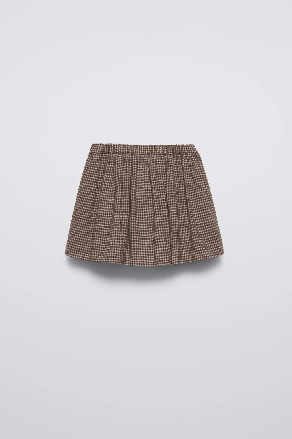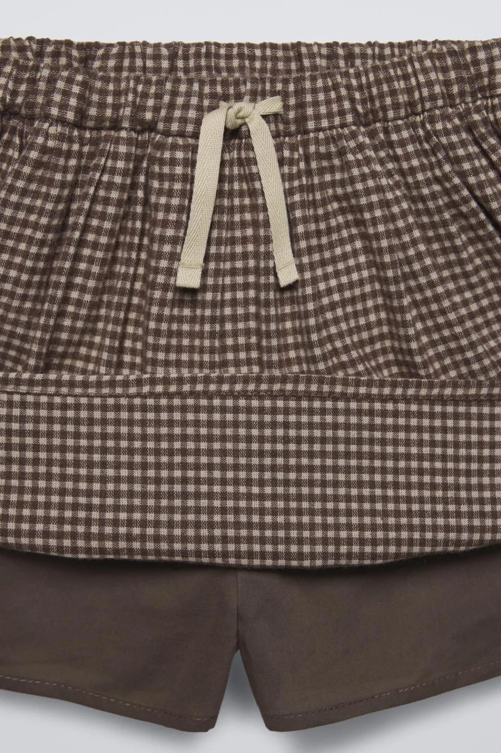 Falda tipo bermuda con cinturilla elástica y aplique cordones en frontal. Estampado cuadros.