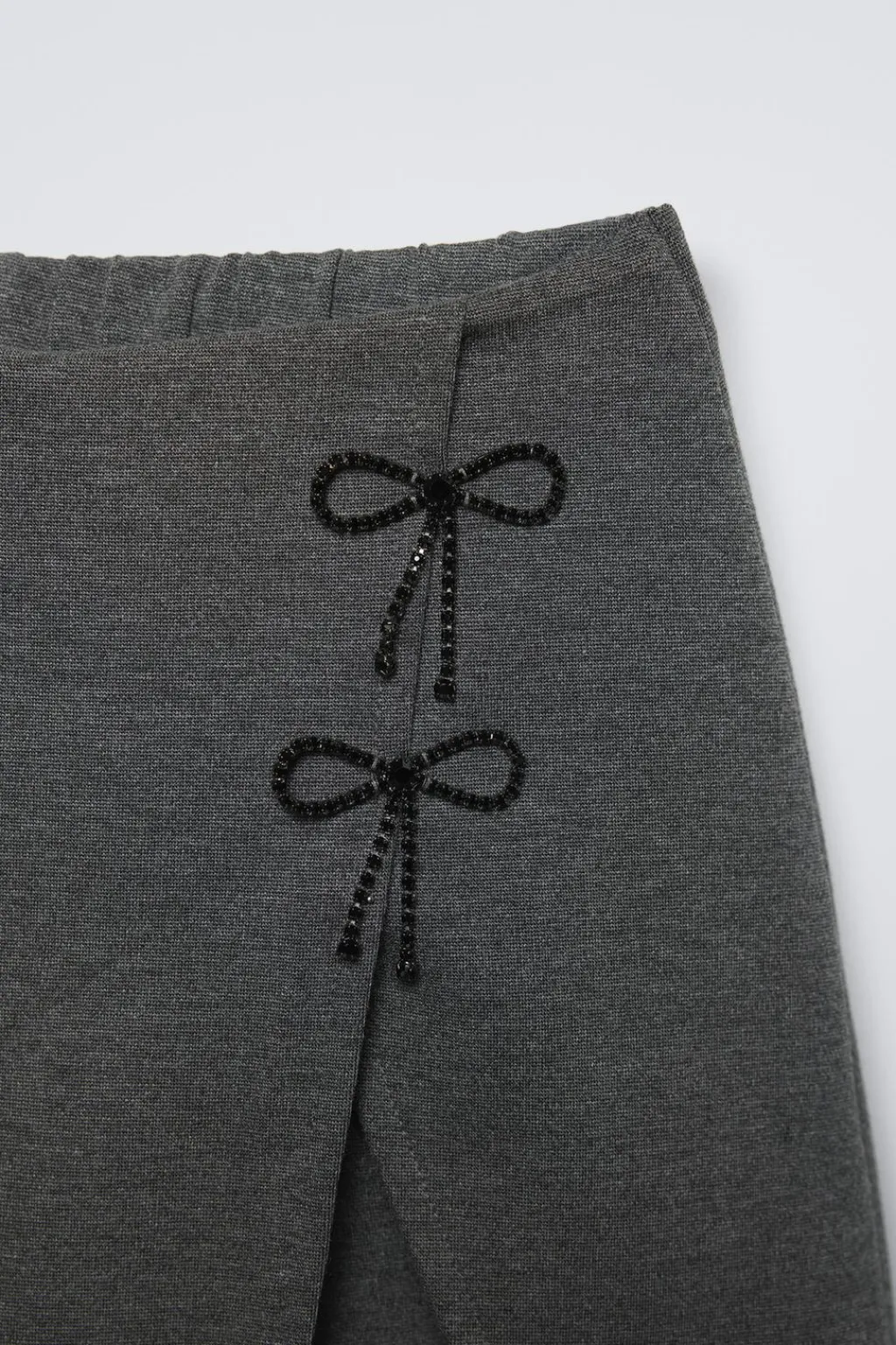 Falda tipo bermuda con cinturilla elástica. Detalle pareo frontal con aplique abalorios en forma de lazos.