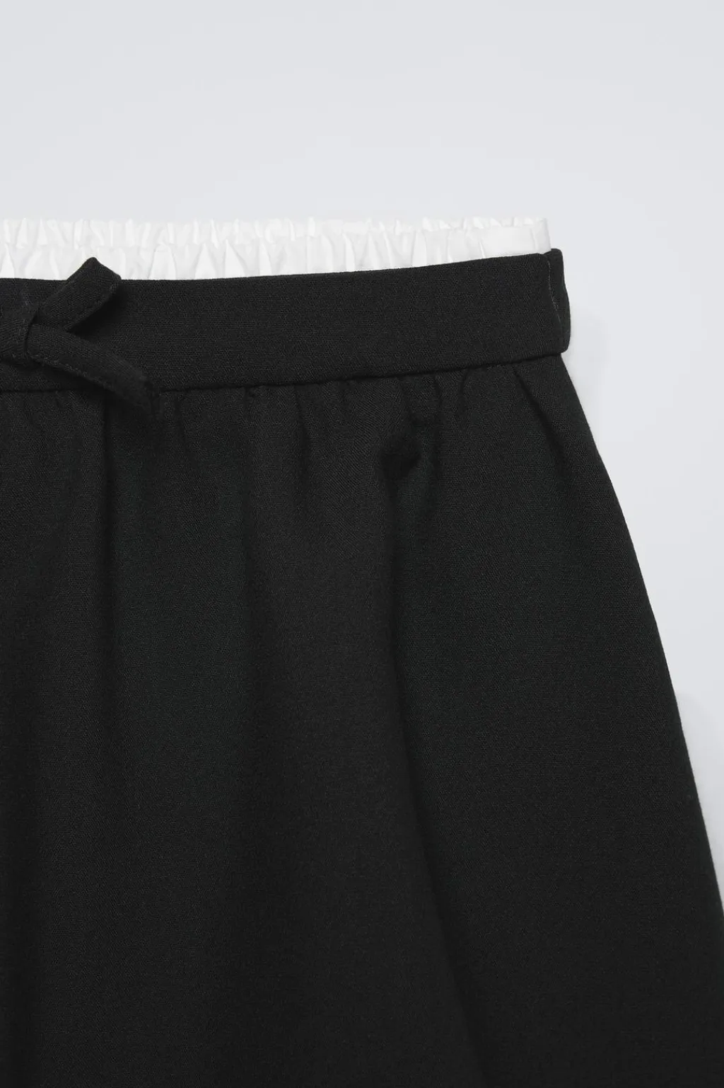 Falda con doble cinturilla elástica y aplique lazo frontal. Bajo acabado en globo con goma.