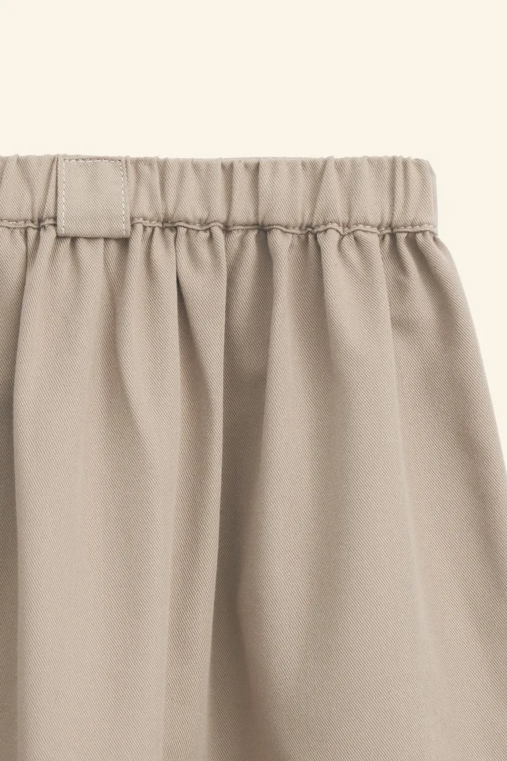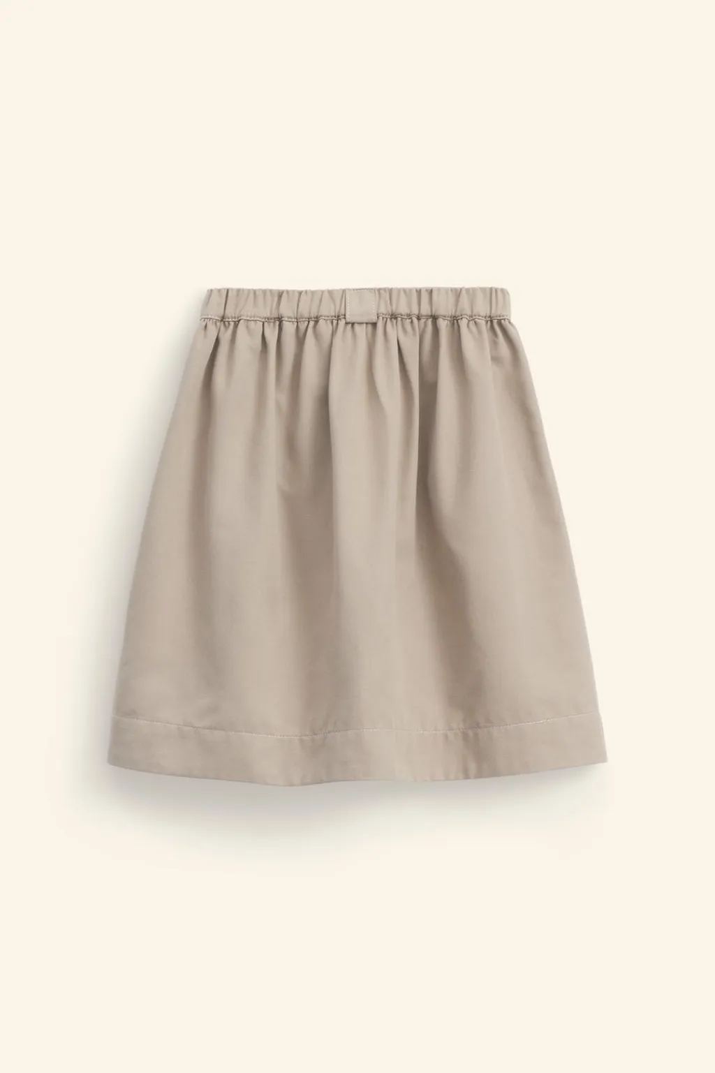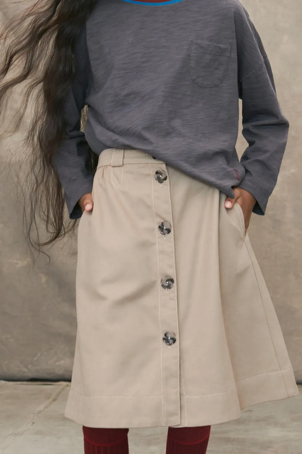Falda tipo midi con cinturilla elástica en espalda y cierre botonadura frontal en forma de flor. Bolsillos en delantero.