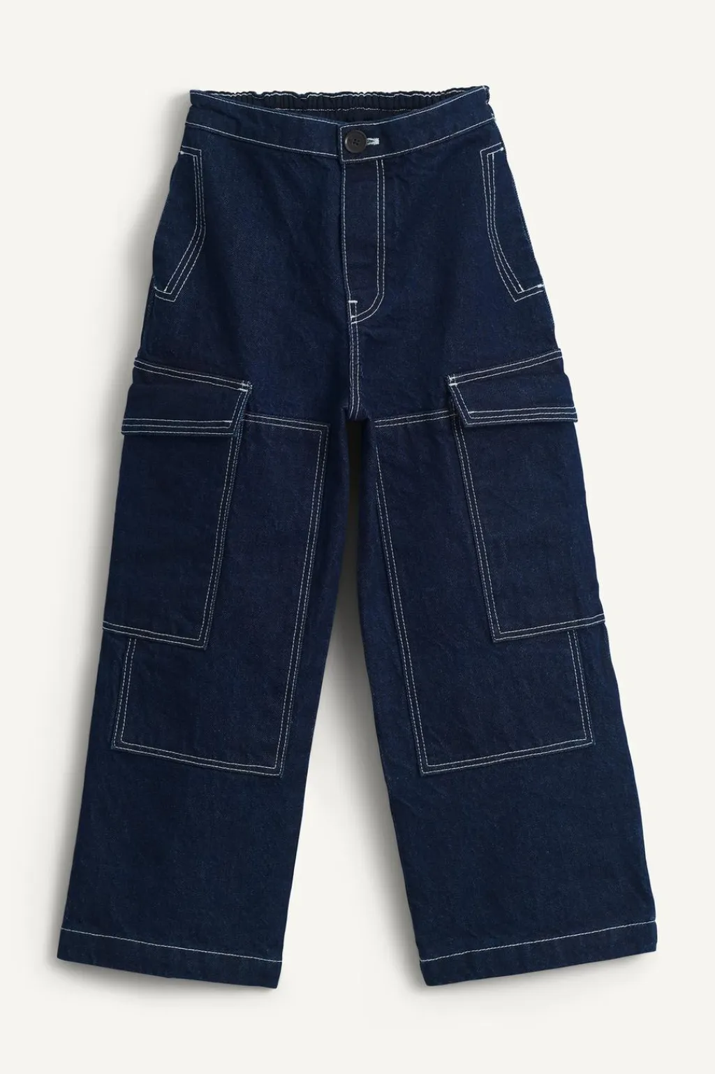 Jeans tipo cargo con cinturilla elástica en espalda y cierre botón frontal. Bolsillos delanteros, de tipo plastrón en espalda y en laterales. Detalle pespuntes con color a contraste.