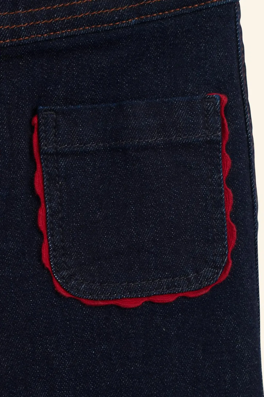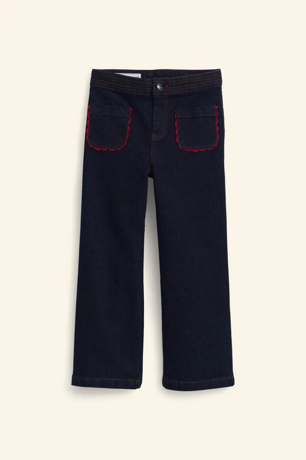 Jeans tipo flare con cinturilla interior ajustable y cierre botón frontal en forma de flor. Bolsillos de tipo plastrón en delantero con aplique ondas a contraste.