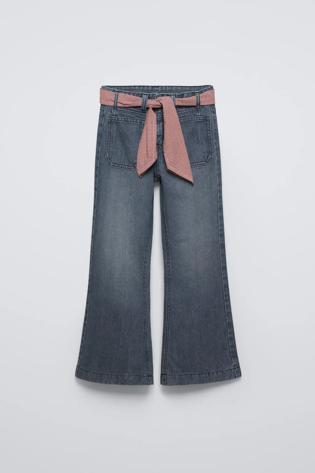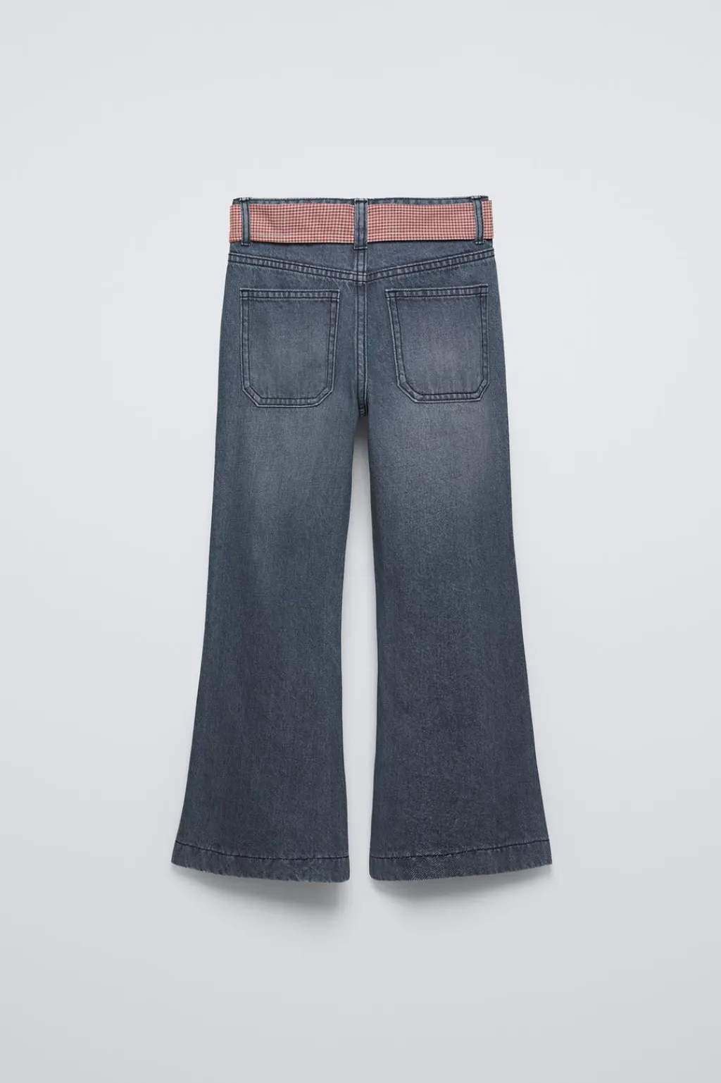 Jeans tipo flare con cinturilla elástica y cierre botón frontal. Aplique cinturón con estampado cuadros en trabillas. Bolsillos de tipo plastrón en delantero y espalda.