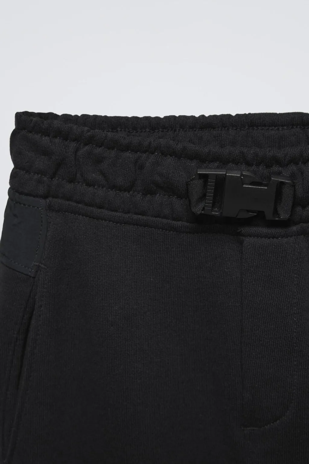 Pantalón con cinturilla elástica y aplique hebilla frontal. Bolsillos delanteros, con detalle vivo en espalda y de tipo plastrón con cierre cremallera en lateral. Bajo acabado en goma.