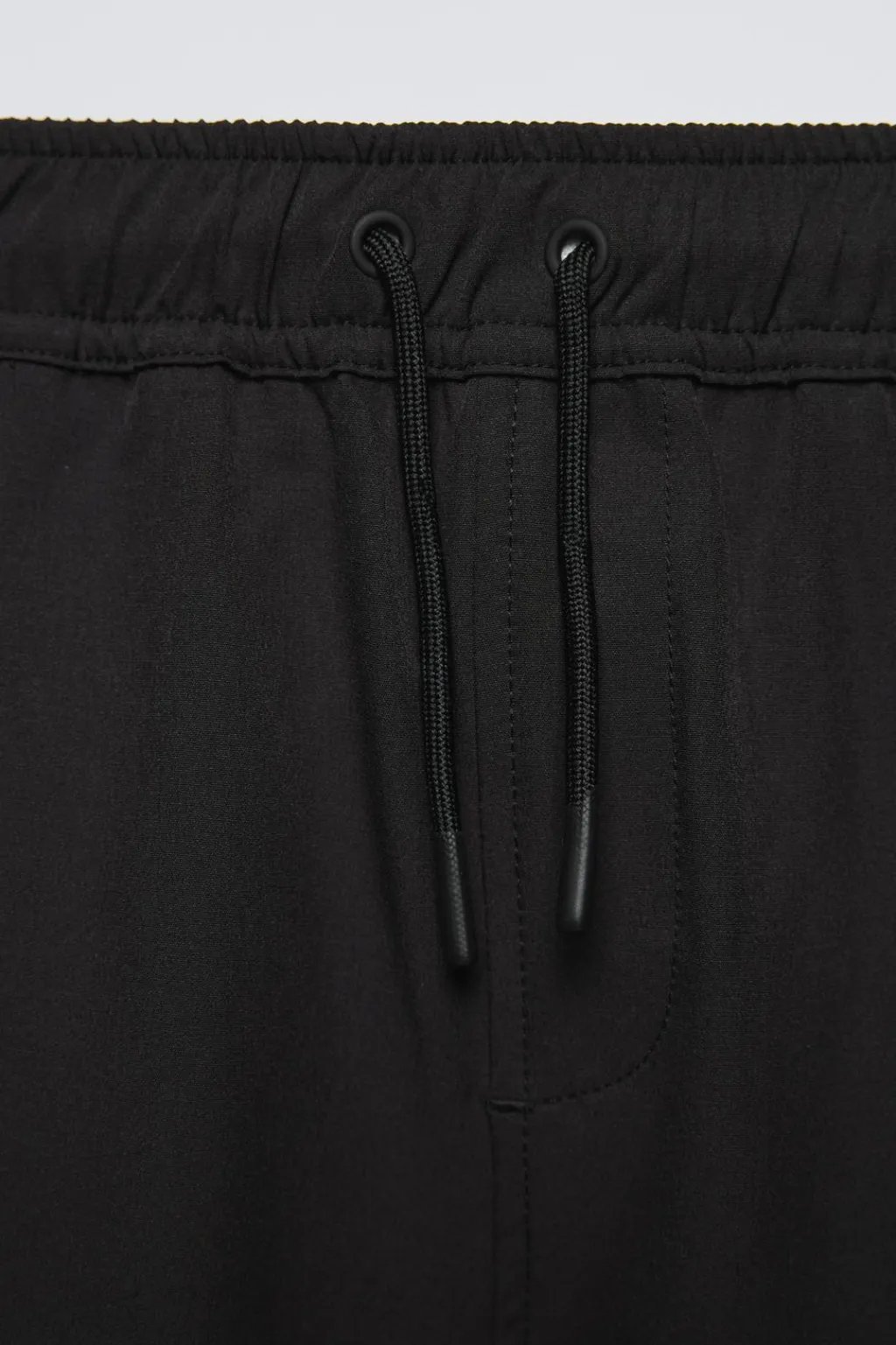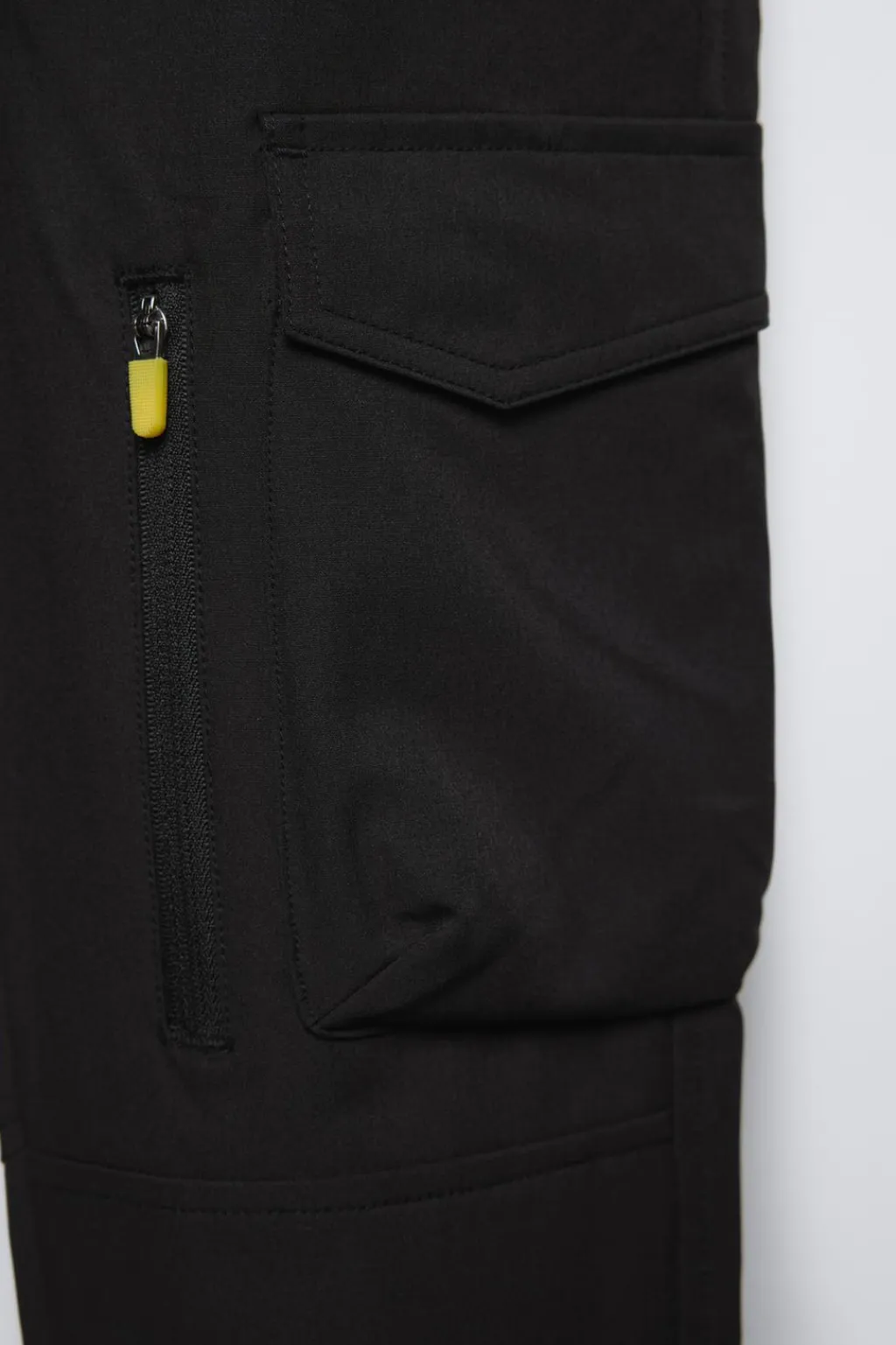 Pantalón técnico nylon con cinturilla elástica y cordones ajustables en frontal. Bajo acabado en puño. Bolsillos con detalle vivo en delantero y de tipo plastrón con tapeta en laterales. Falso bolsillo con cremallera en pernera.