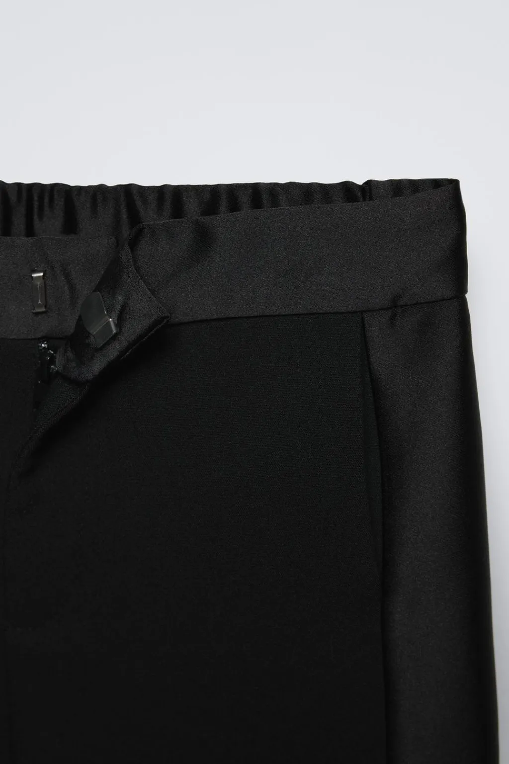 Pantalón con cinturilla elástica y cierre frontal metálico. Bolsillos delanteros y con detalle vivo en espalda. Detalle banda lateral en tejido satinado.