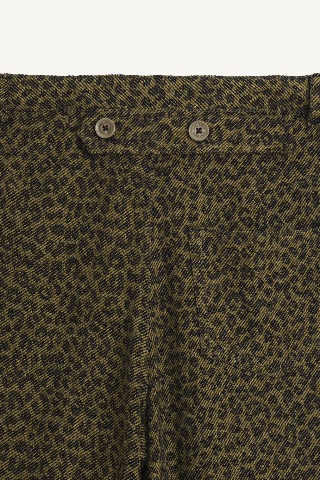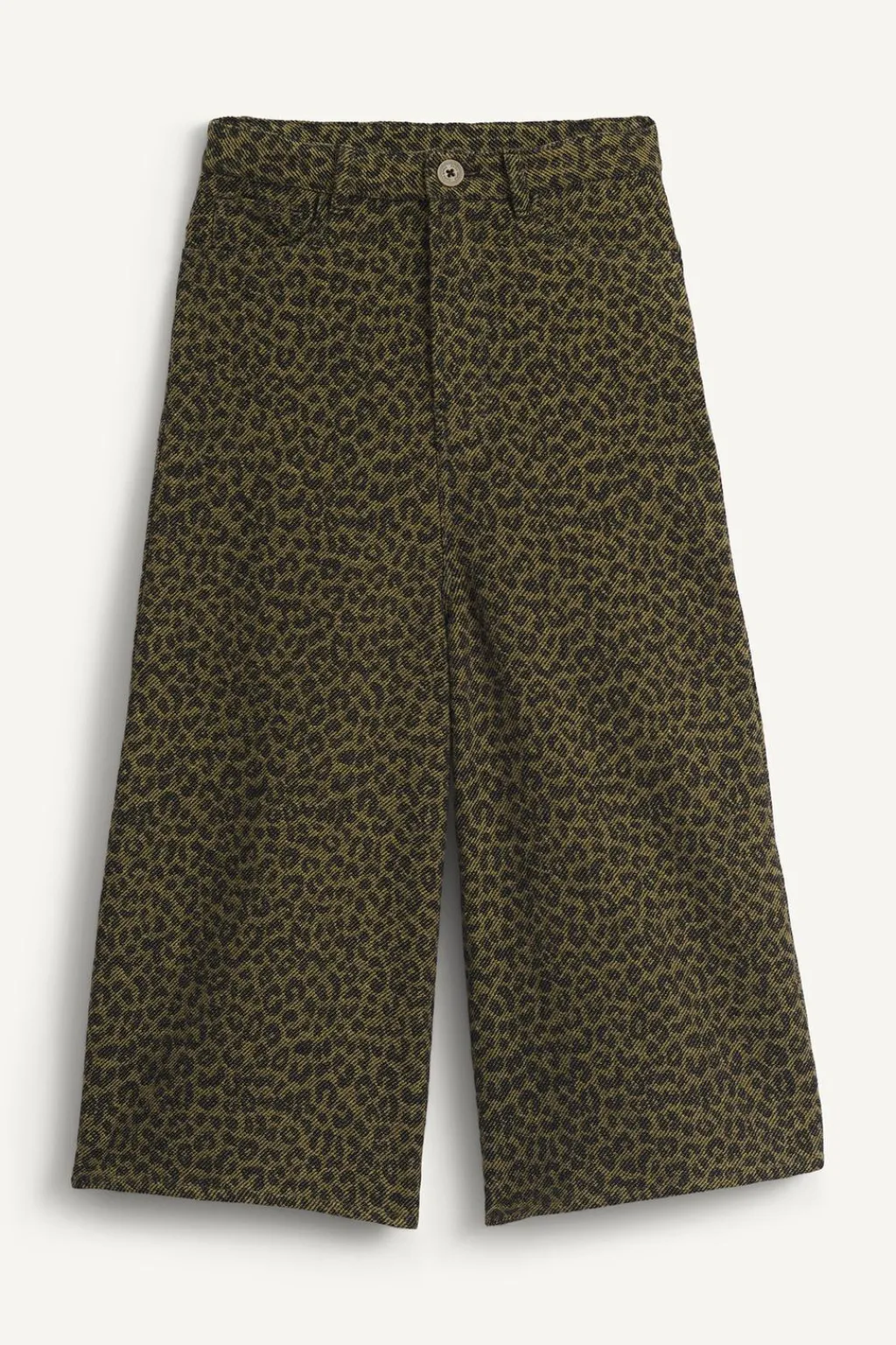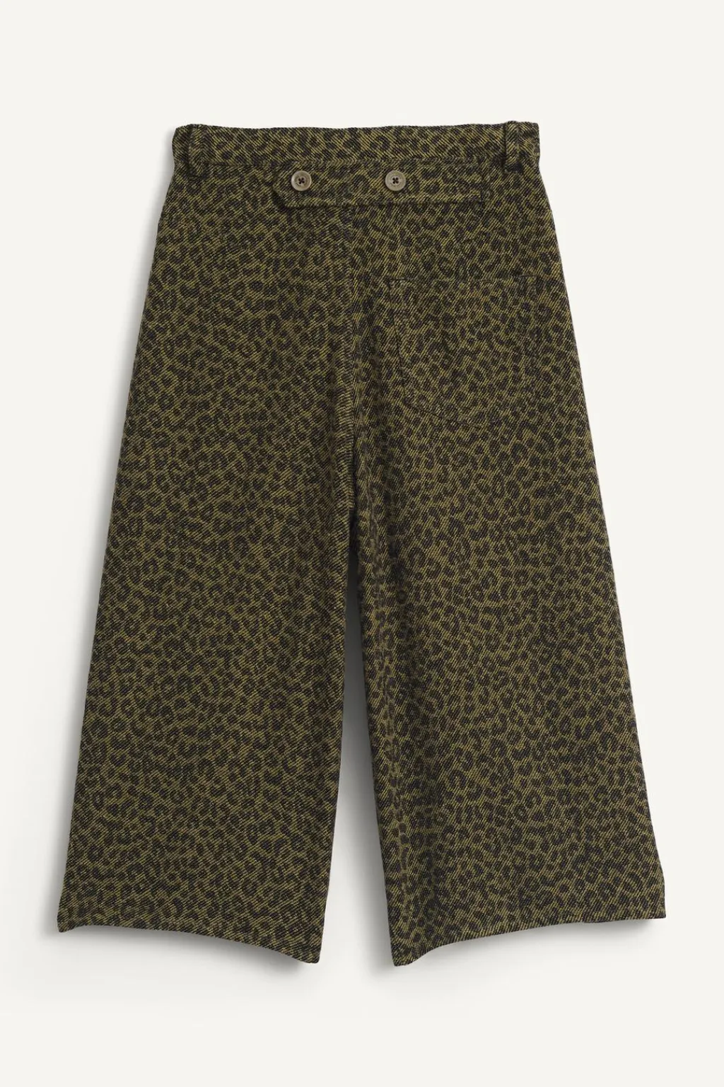 Pantalón con un fit ancho y estampado de animal print. Con cinturilla interior ajustable y cierre botón frontal, aplique trabillas. Bolsillos en delantero y de tipo plastrón en espalda. Aplique tira con botones en espalda.
