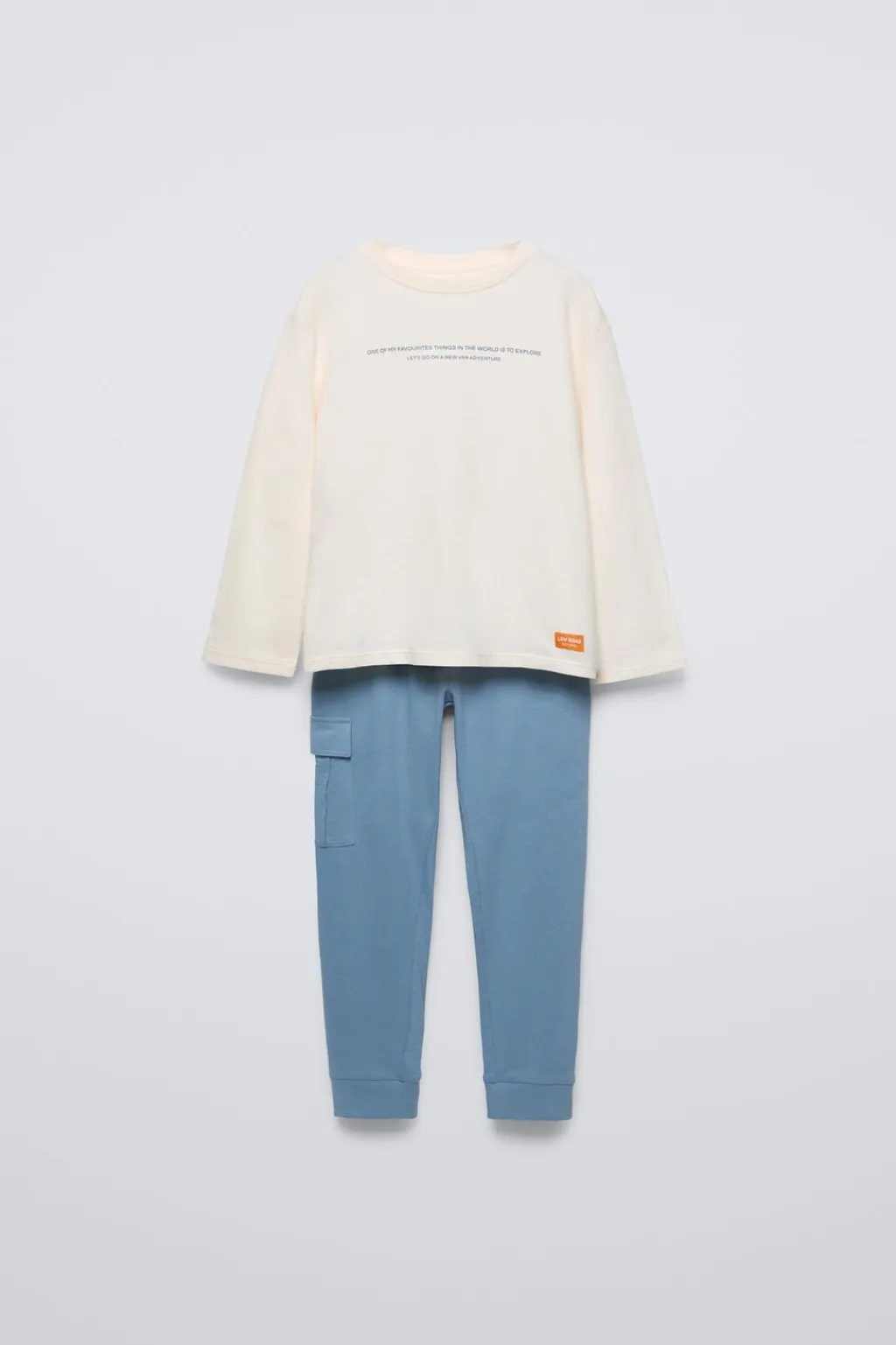 Pijama de dos piezas. Camiseta con cuello redondo y manga larga. Estampado texto en delantero y estampado caravana en espalda. Aplique etiqueta en bajo. Pantalón con cinturilla elástica y aplique cordones en delantero. Bolsillo tipo plastrón con tapeta en pernera. Acabados en rib.