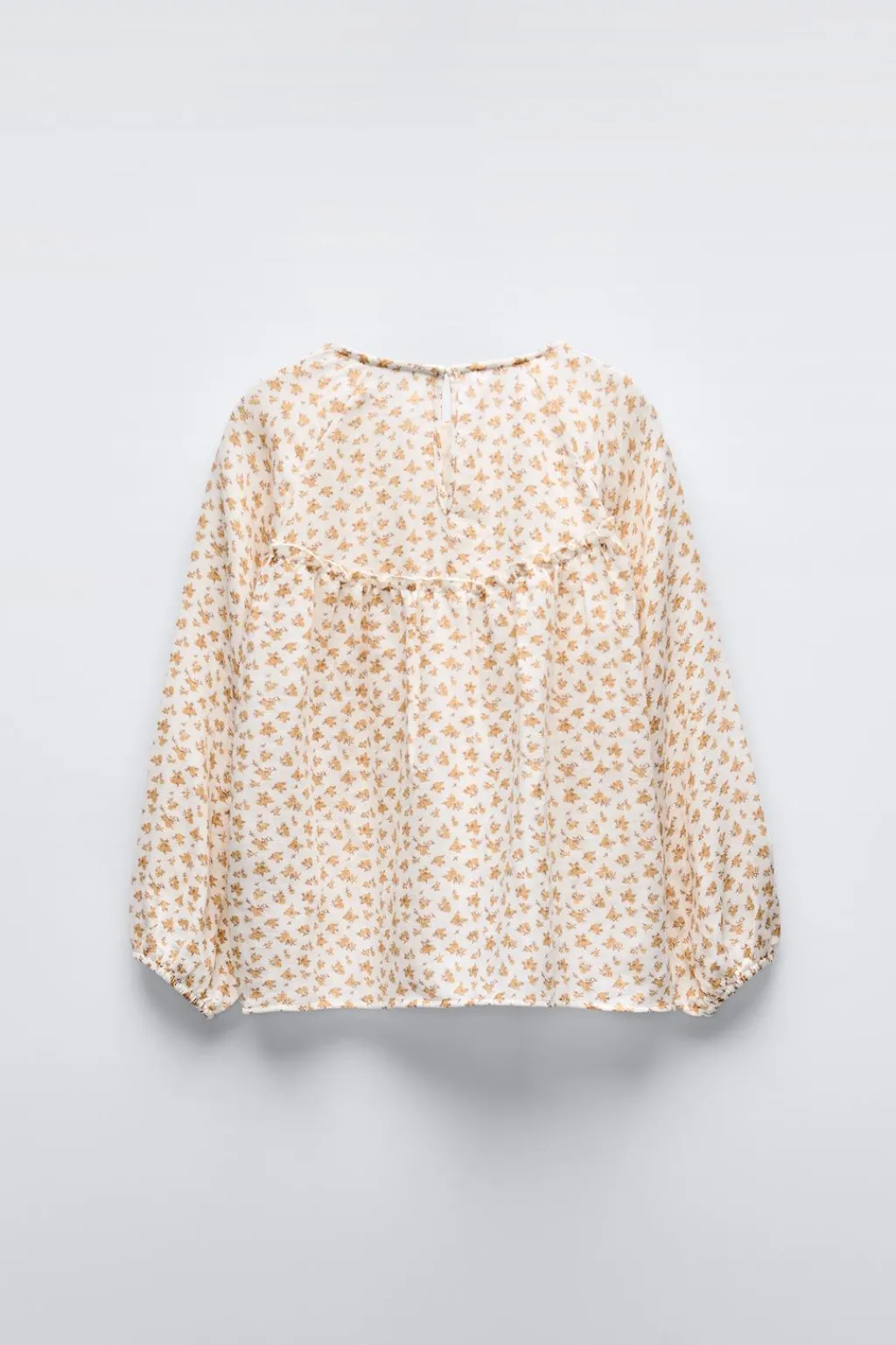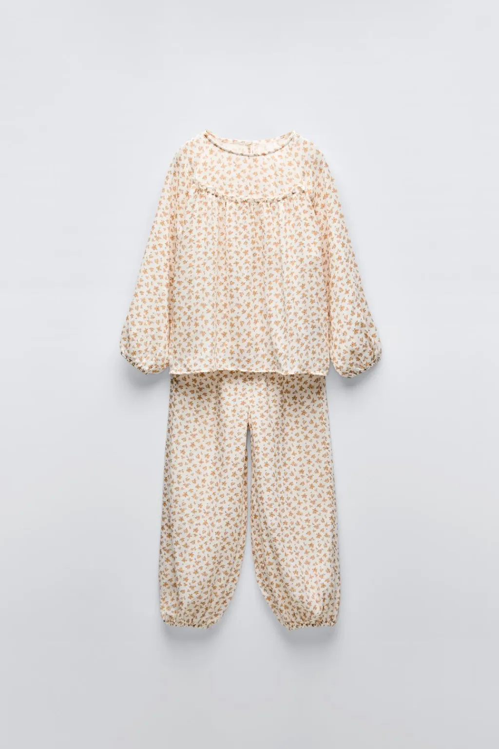 Pijama de dos piezas. Camiseta con cuello redondo y manga larga acabada en goma. Detalle volante en canesú. Cierre tipo lágrima con botón en espalda. Pantalón con cinturilla elástica y bajo acabado en goma.