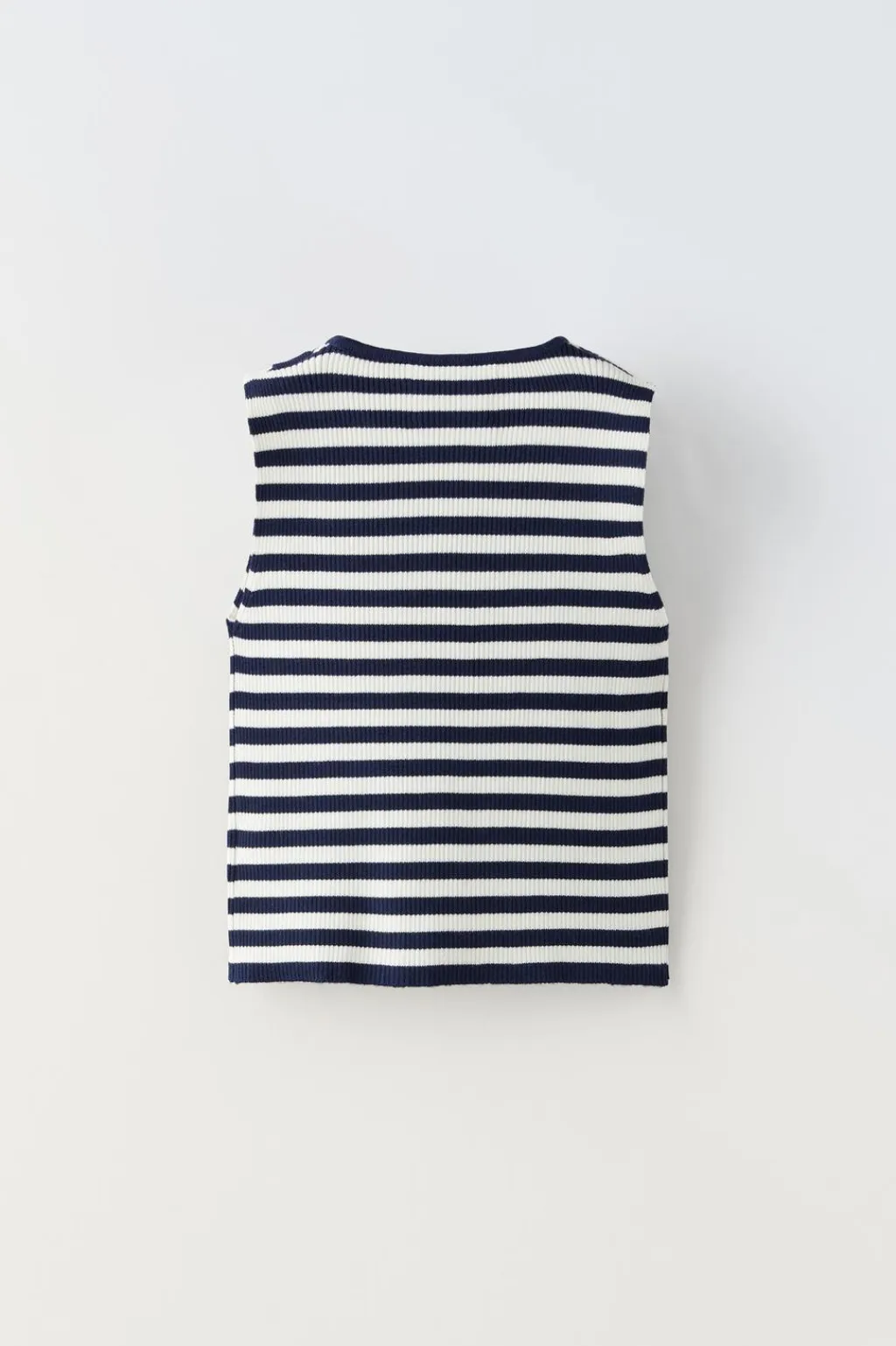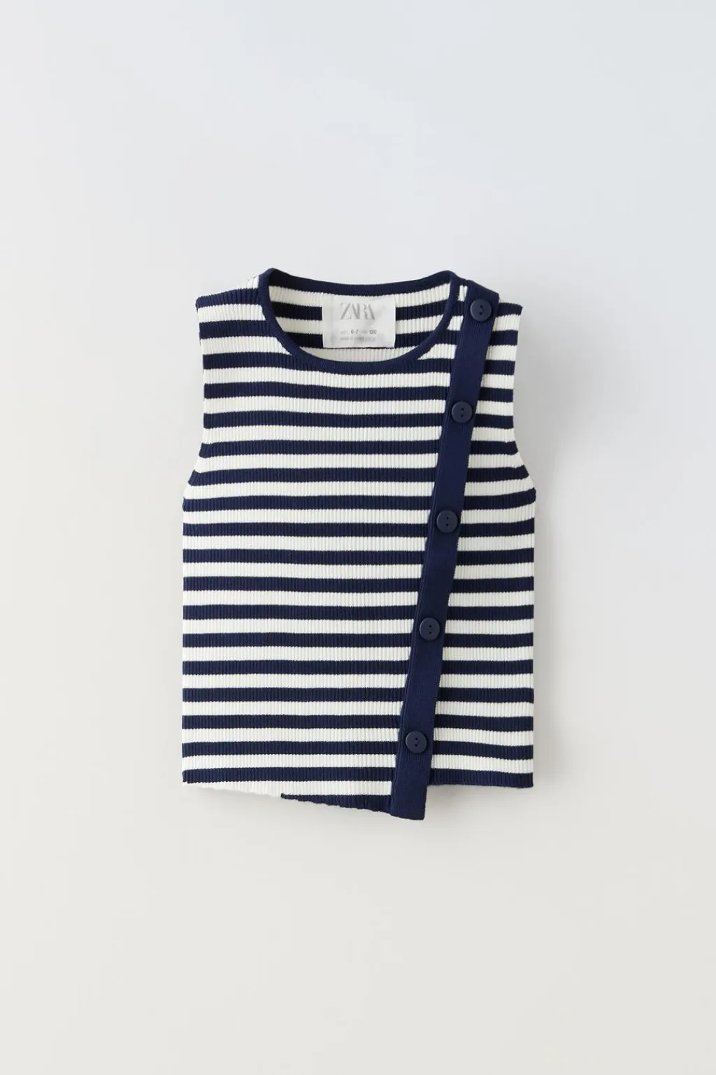 Top con cuello redondo y sin mangas. Aplique tapeta con botones en delantero.