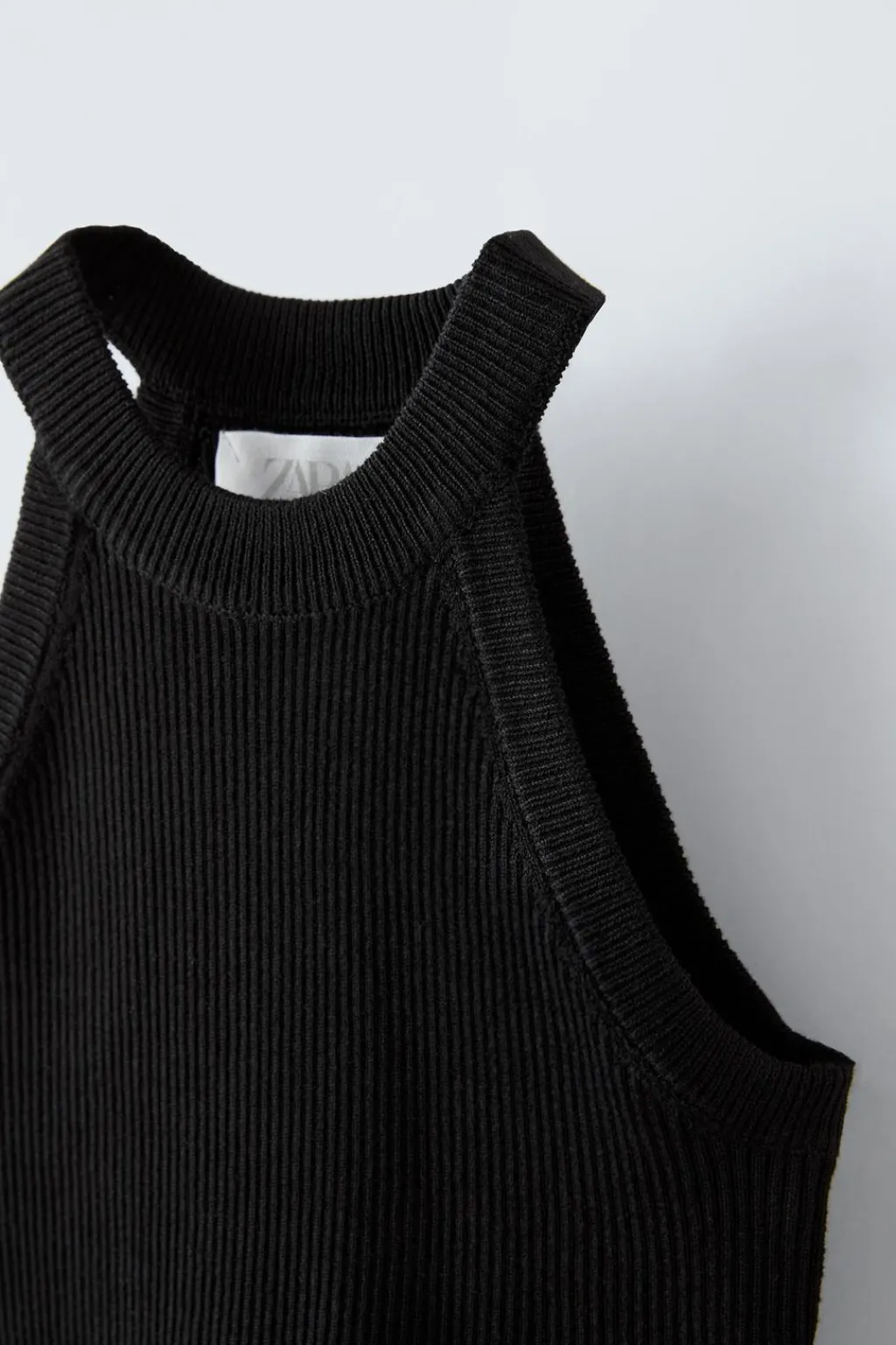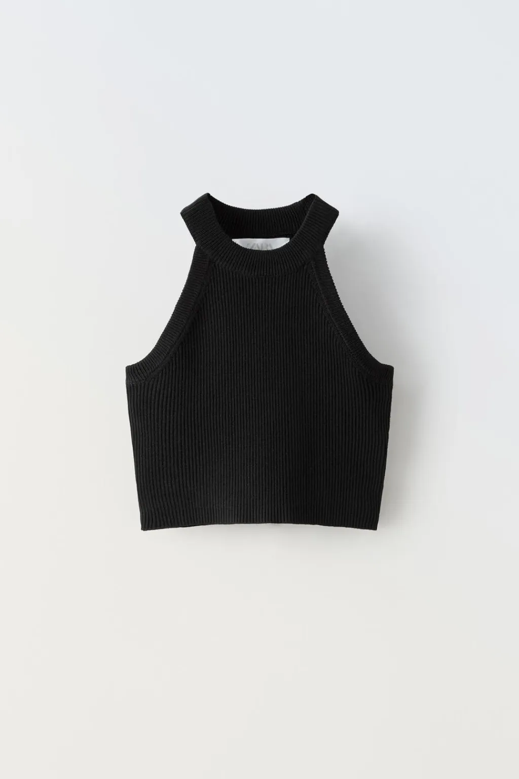 Top rib con cuello tipo halter y sin mangas.
