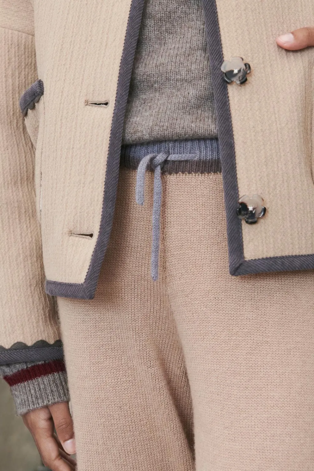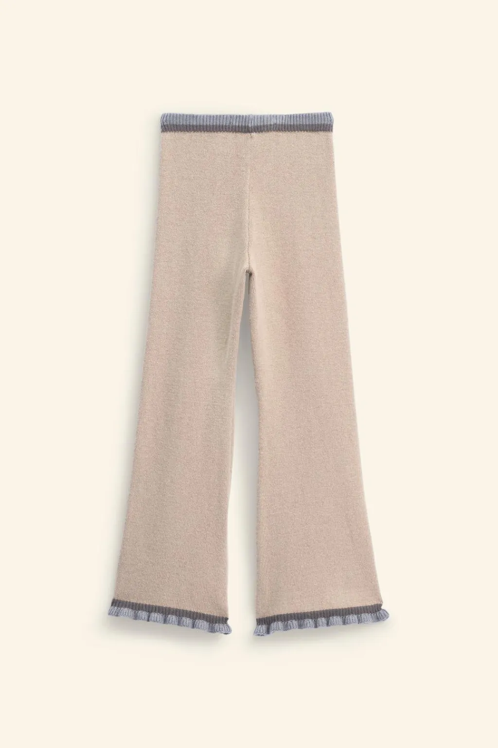 Pantalón de punto con cinturilla elástica y aplique cordones frontal. Bajo acabado en ondas con color a contraste.