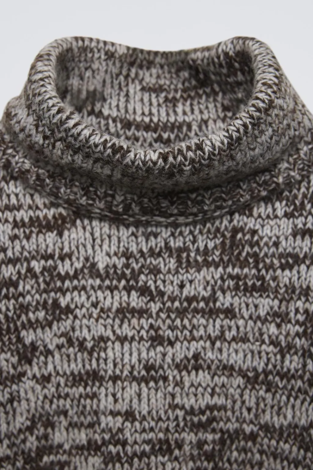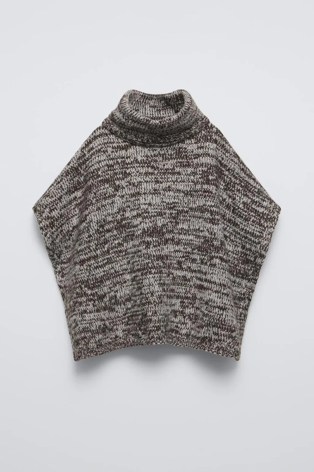 Poncho de punto jaspeado con cuello vuelto y manga corta.