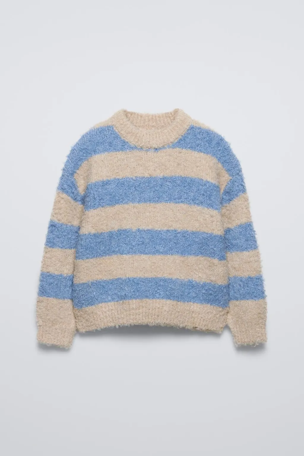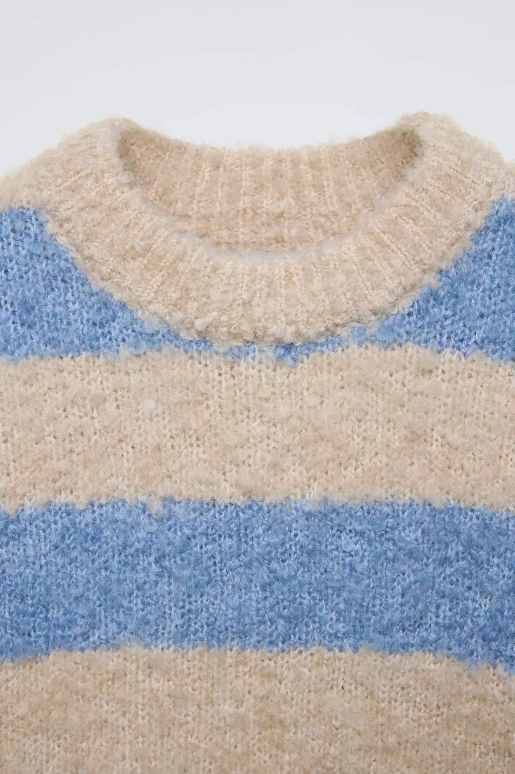 Jersey punto bouclé con cuello redondo y manga larga. Estampado rayas.