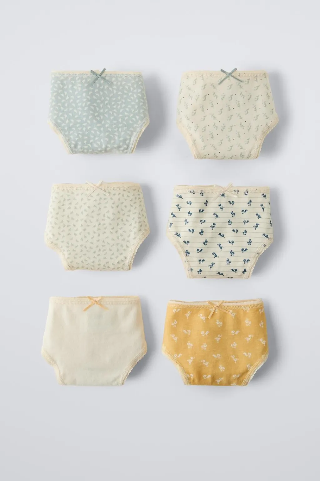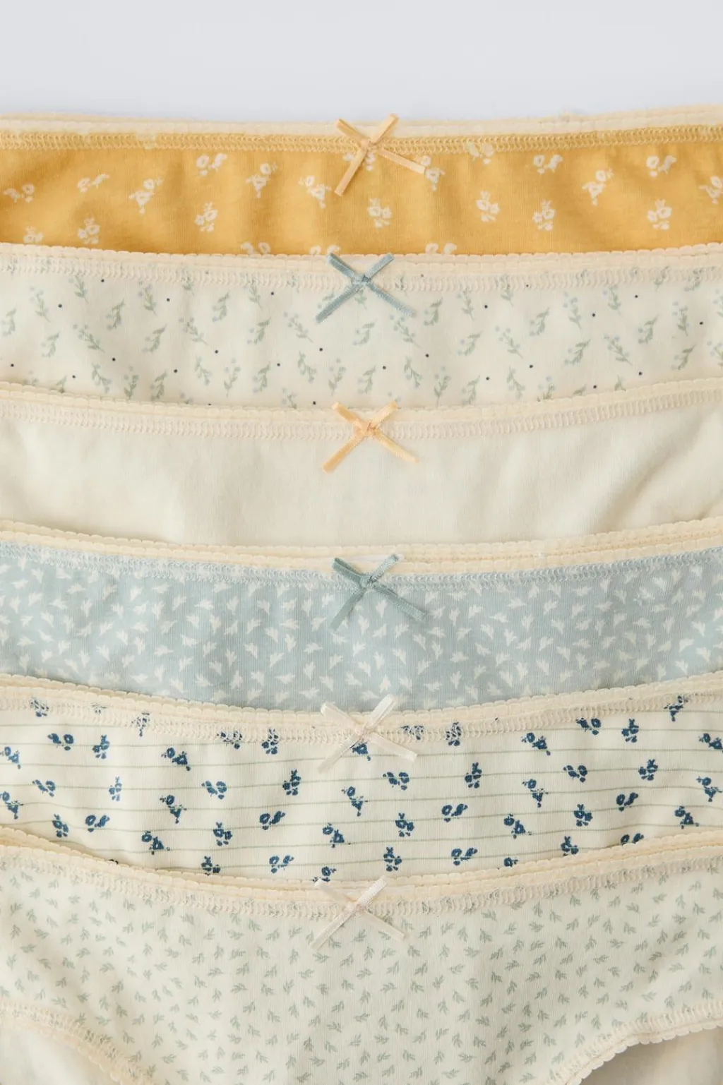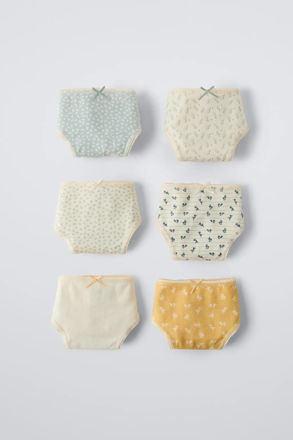Pack de seis braguitas con cinturilla elástica y aplique lazo frontal. Estampado flores.